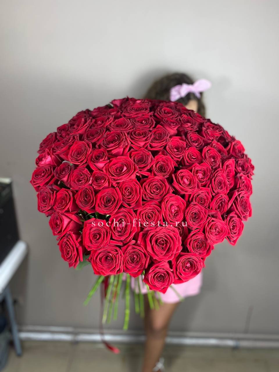 Сто одна голландская роза в букете — это история о масштабе и впечатлении. Объем композиции наполняет комнату и мгновенно притягивает внимание своим присутствием.