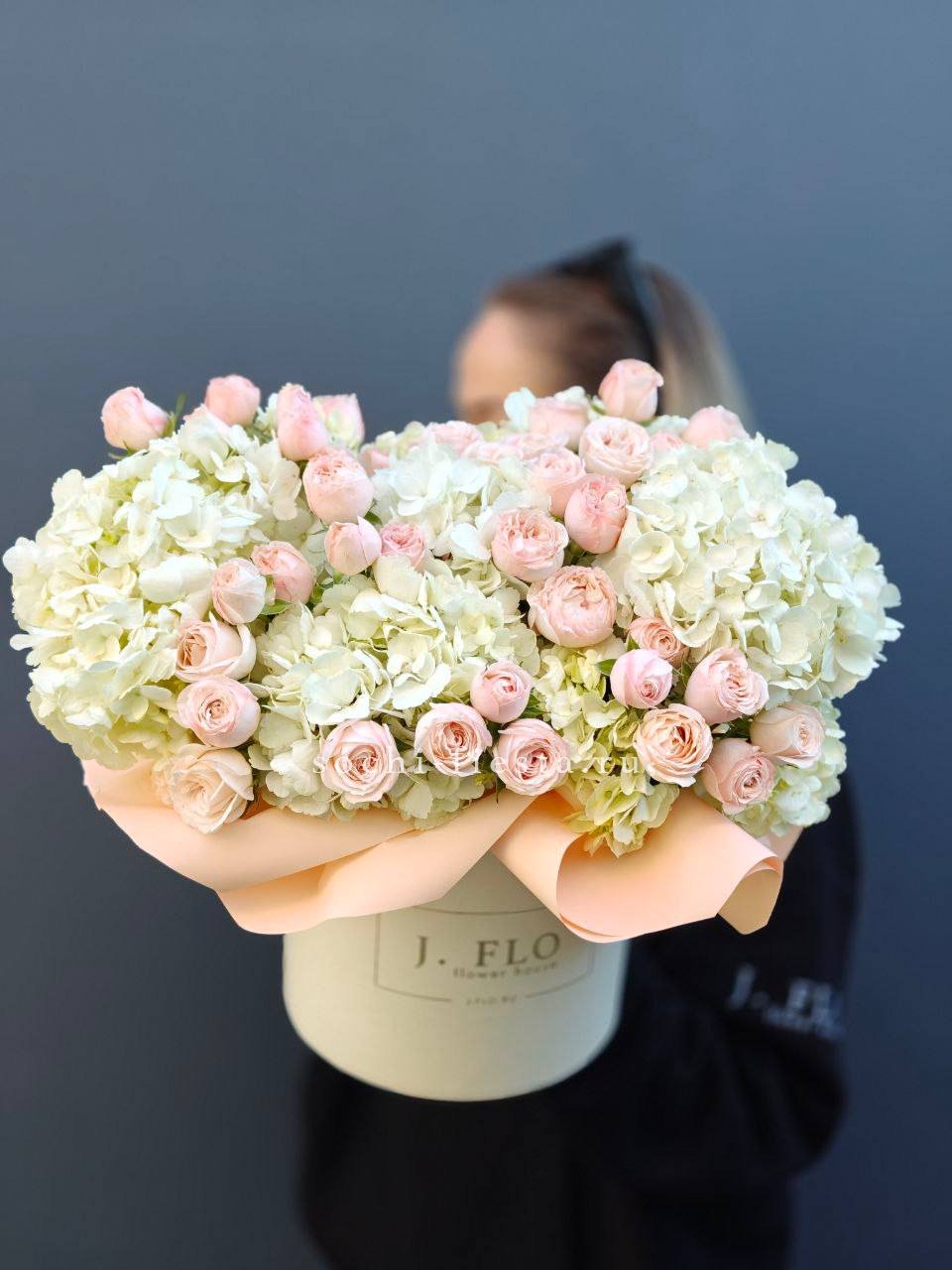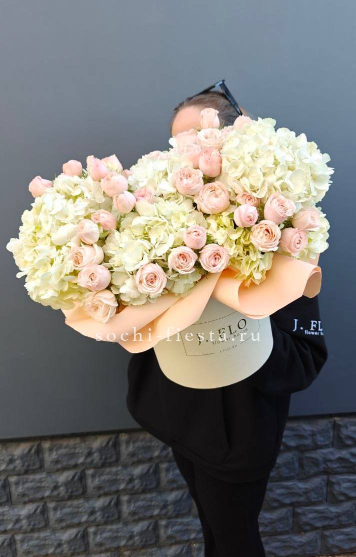 Сто один бутон кенийского пионовидного сорта собраны в масштабную композицию. Белая окантовка лепестков переходит в розовый центр. Впечатляющее присутствие в любом пространстве.