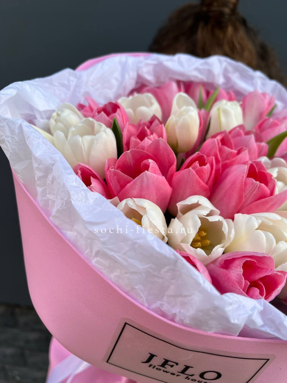 тюльпаны белые и розовые микс в нежном оформлении.