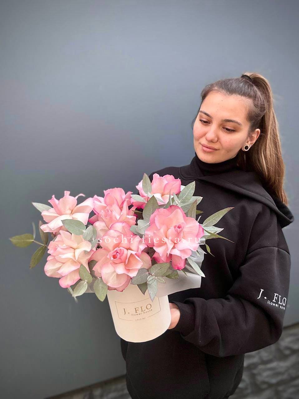 вывернутые розы, цилиндр D13, эвкалипт, лента, упаковка.