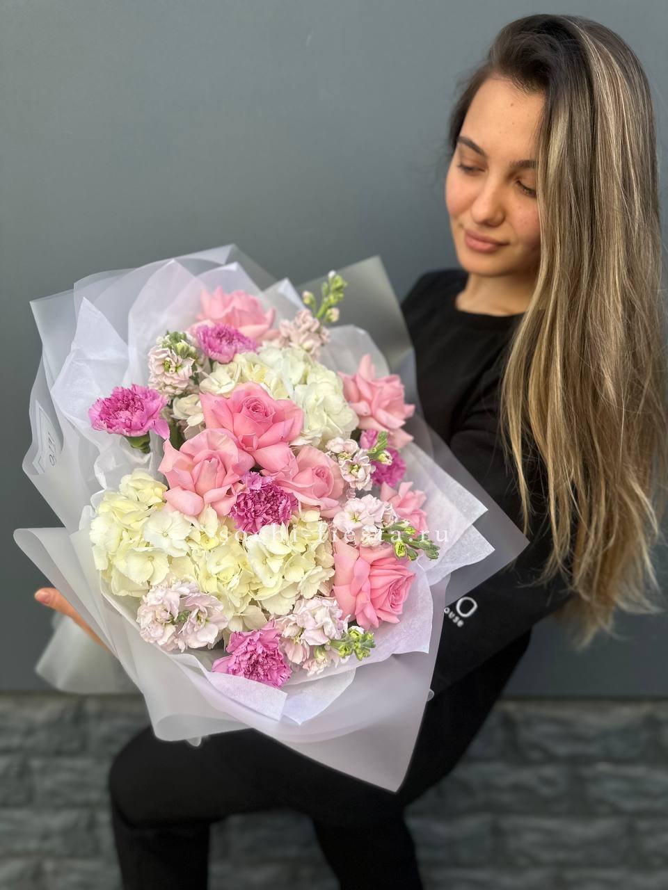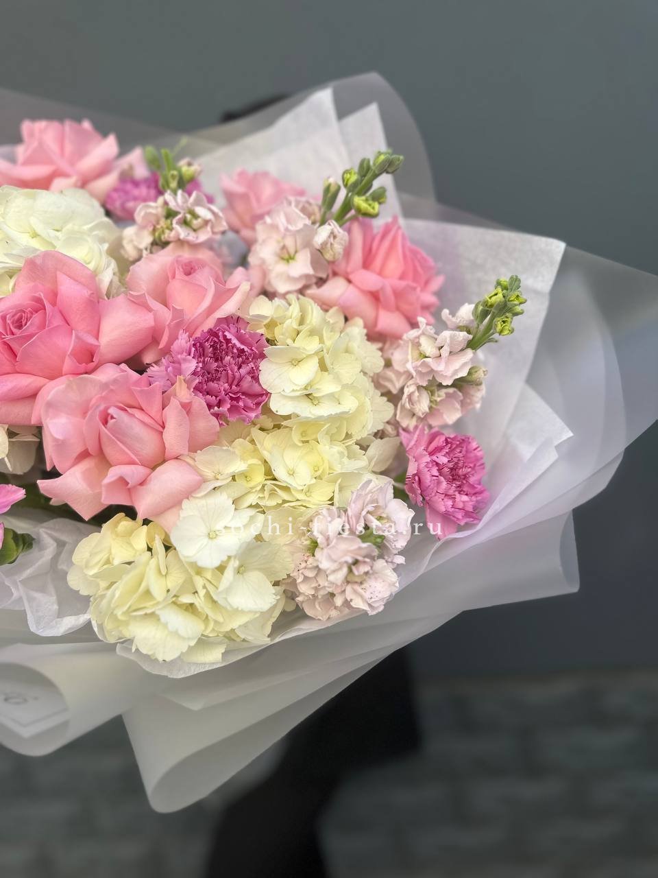 маттиола, розовые розы, гортензии, диантусы, лента и дизайнерская пленка.