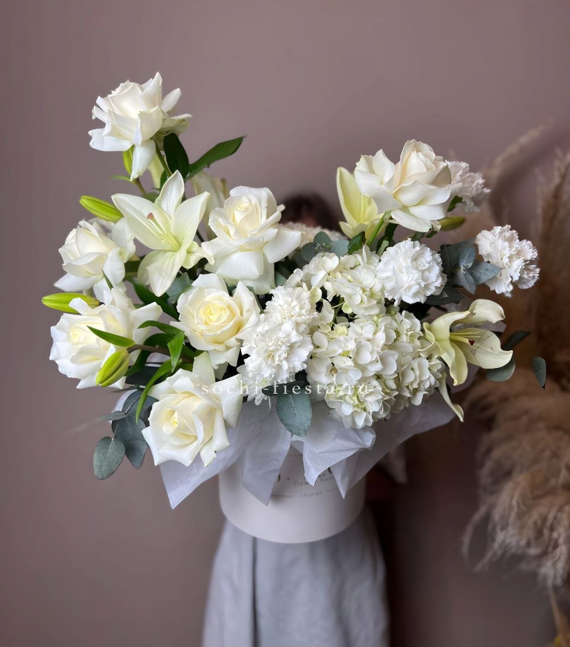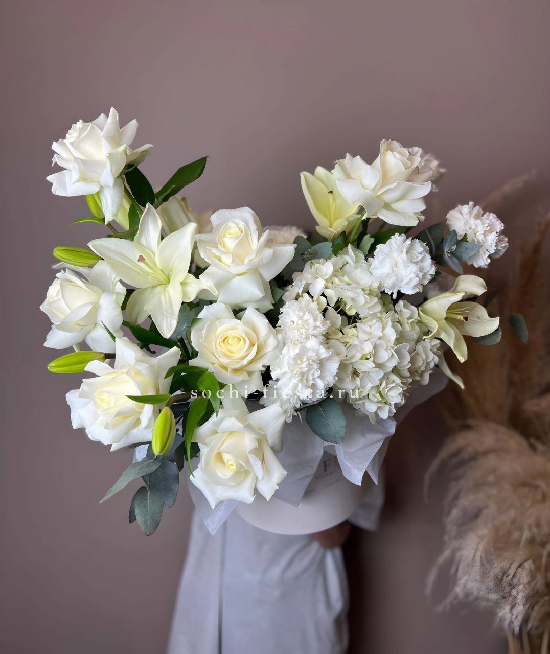 Розы и гортензия формируют объемную текстуру, где каждый бутон раскрыт по-своему. Эустома заполняет пространство между крупными соцветиями, а эвкалипт обрамляет композицию мягкой зеленой волной.