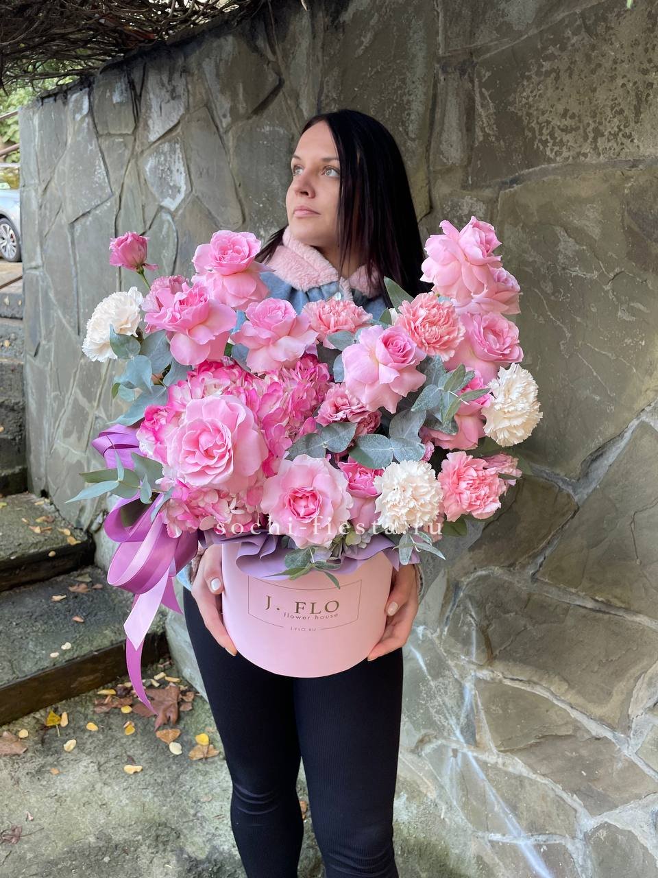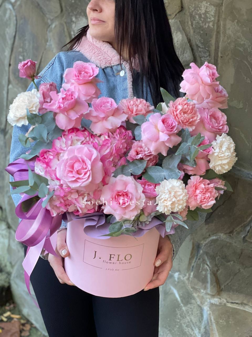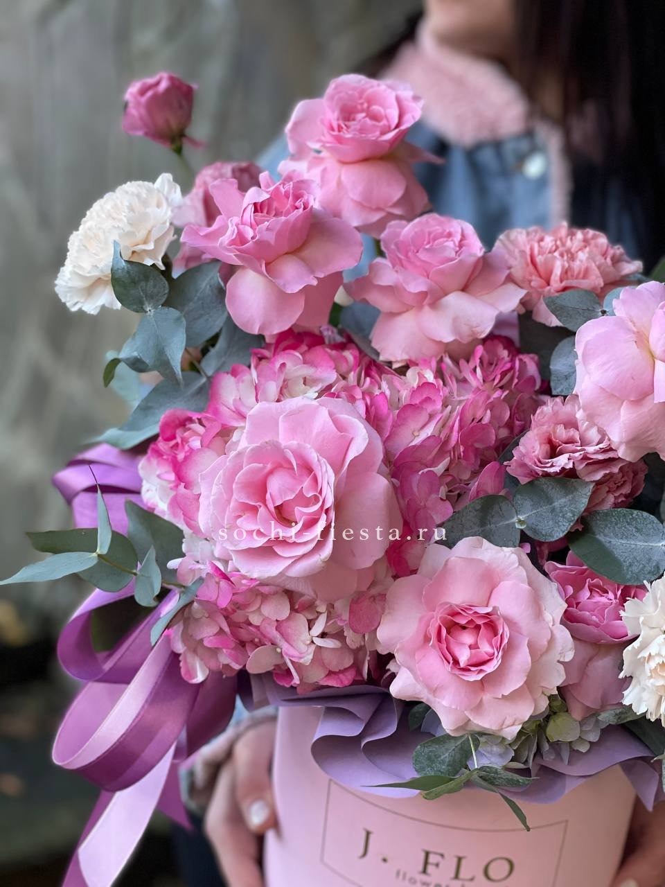 гортензия, эустома, диантусы, французские розы, эвкалипт, цилиндр D20.