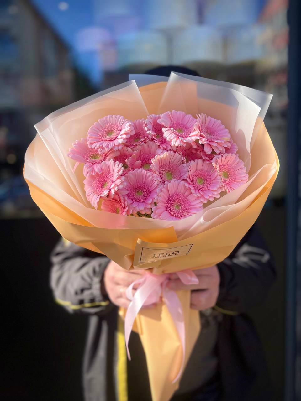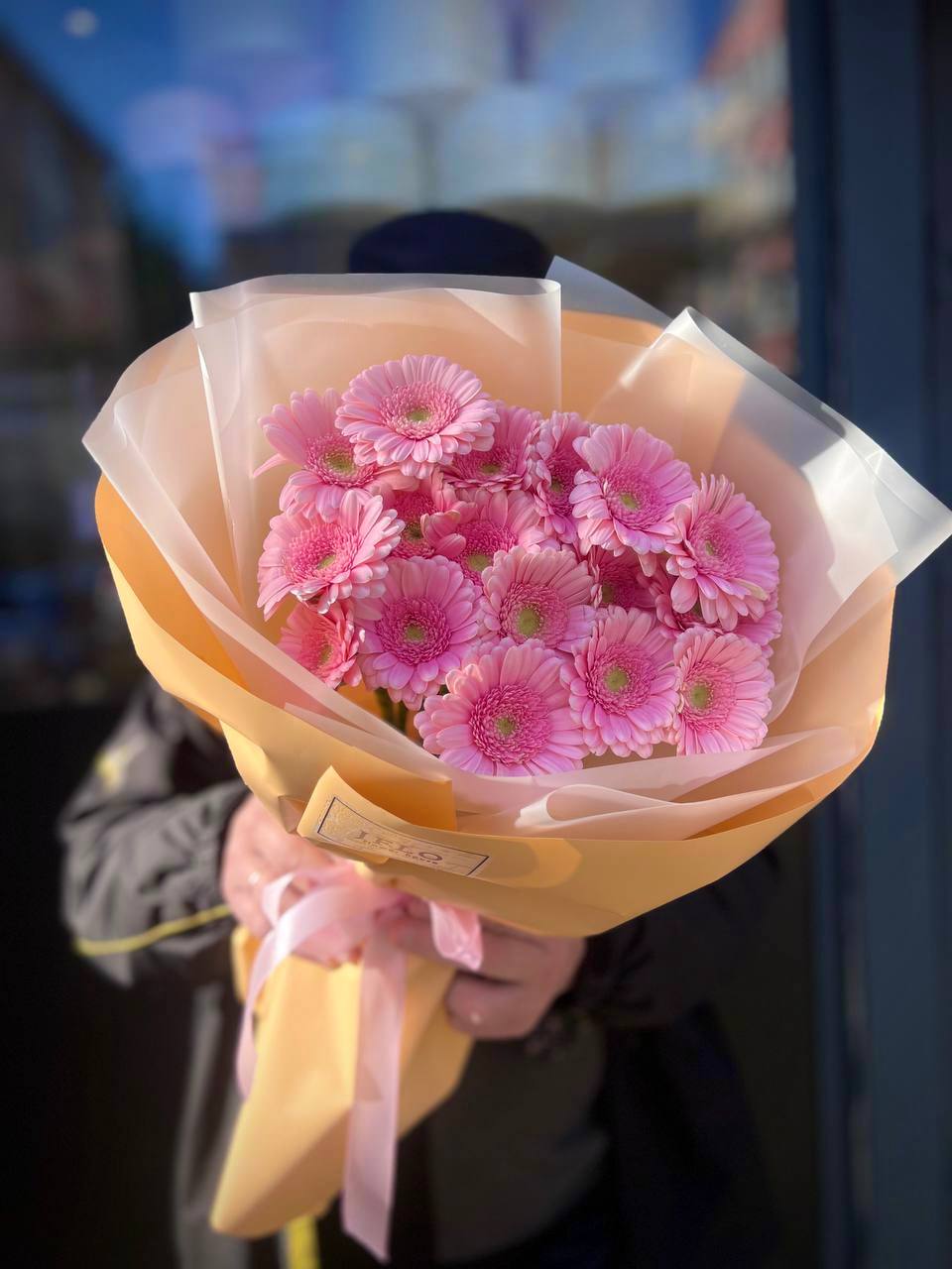 Семнадцать гербер собраны в плотный круг, где каждый цветок раскрыт полностью и направлен вперёд. Розовый оттенок переходит от пудрового по краям к более насыщенному в центре каждого бутона. Букет держит форму и легко помещается в руке.
