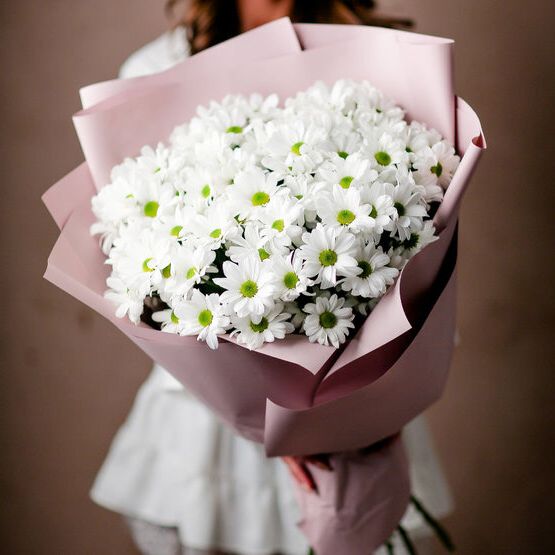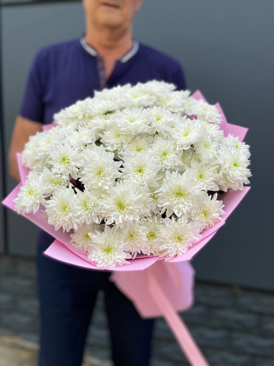 Семь веток кустовой хризантемы обрамлены лавандовым фоамираном, который мягко перекликается с оттенками бутонов. Композиция собрана свободно, сохраняя естественную пластику стеблей и живость форм.