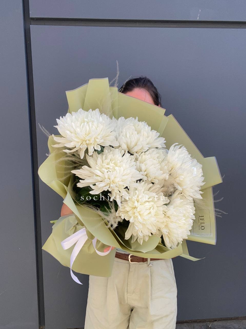 Крупные головки хризантем дополнены воздушными метёлками ковыля. Лаконичная упаковка сохраняет естественную красоту цветов и позволяет разместить букет в любом пространстве.