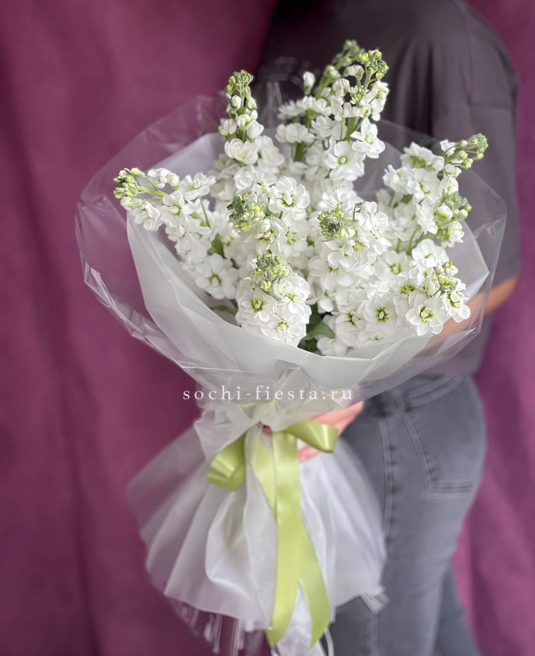 Девять веток маттиолы в лаконичной упаковке хорошо держат форму и долго сохраняют свежесть. Компактная композиция удобна для размещения на столе или узкой полке.