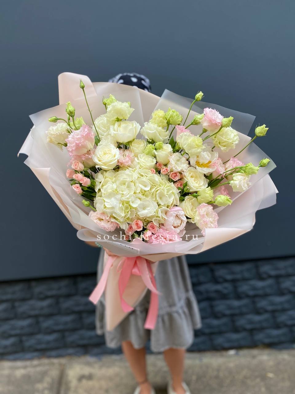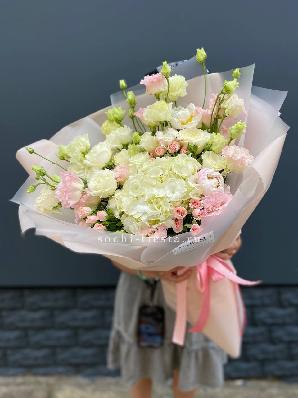пионовидная роза Мисти Баблс, гортензия, голландские пионы, лента, упаковка.