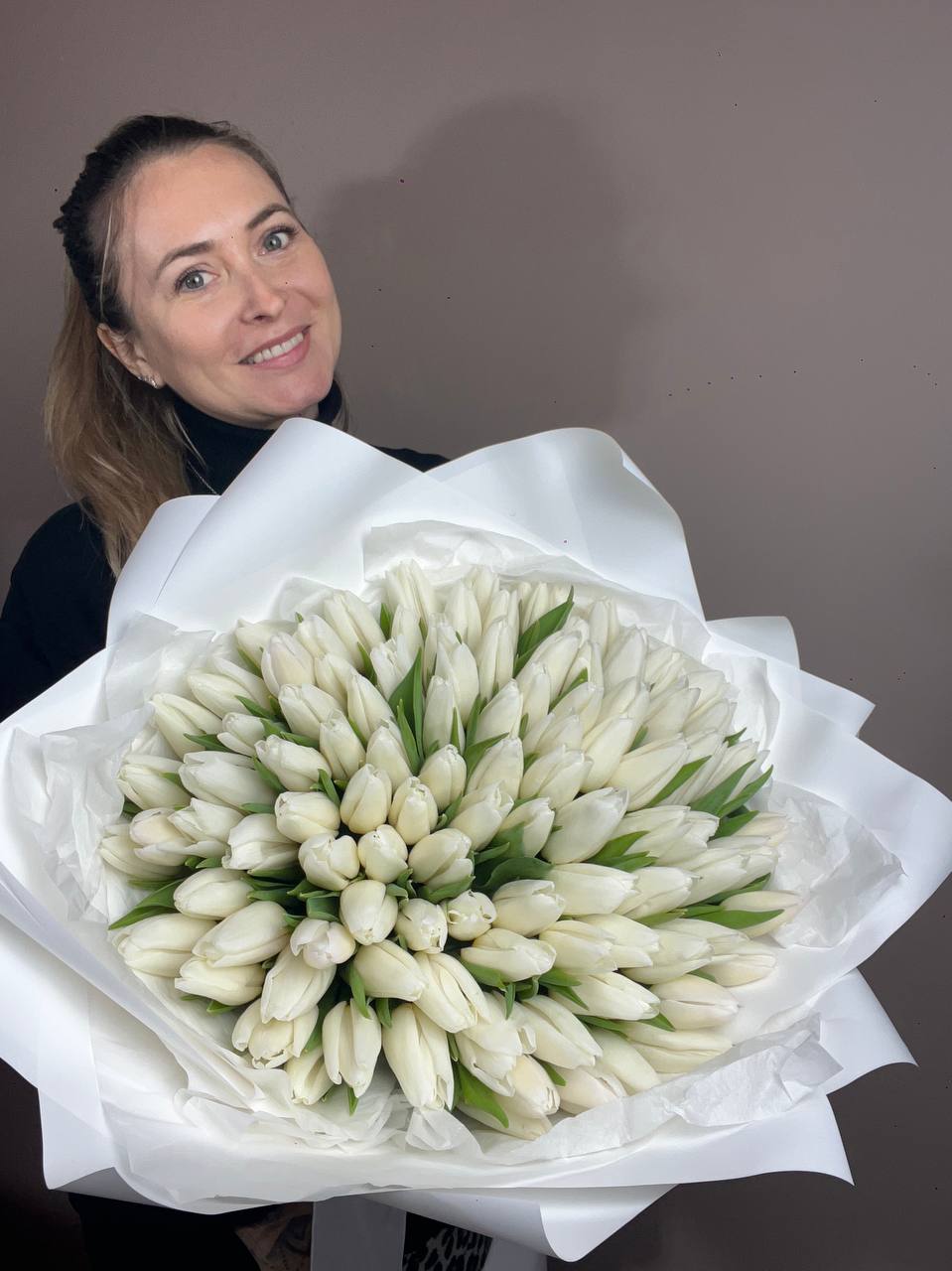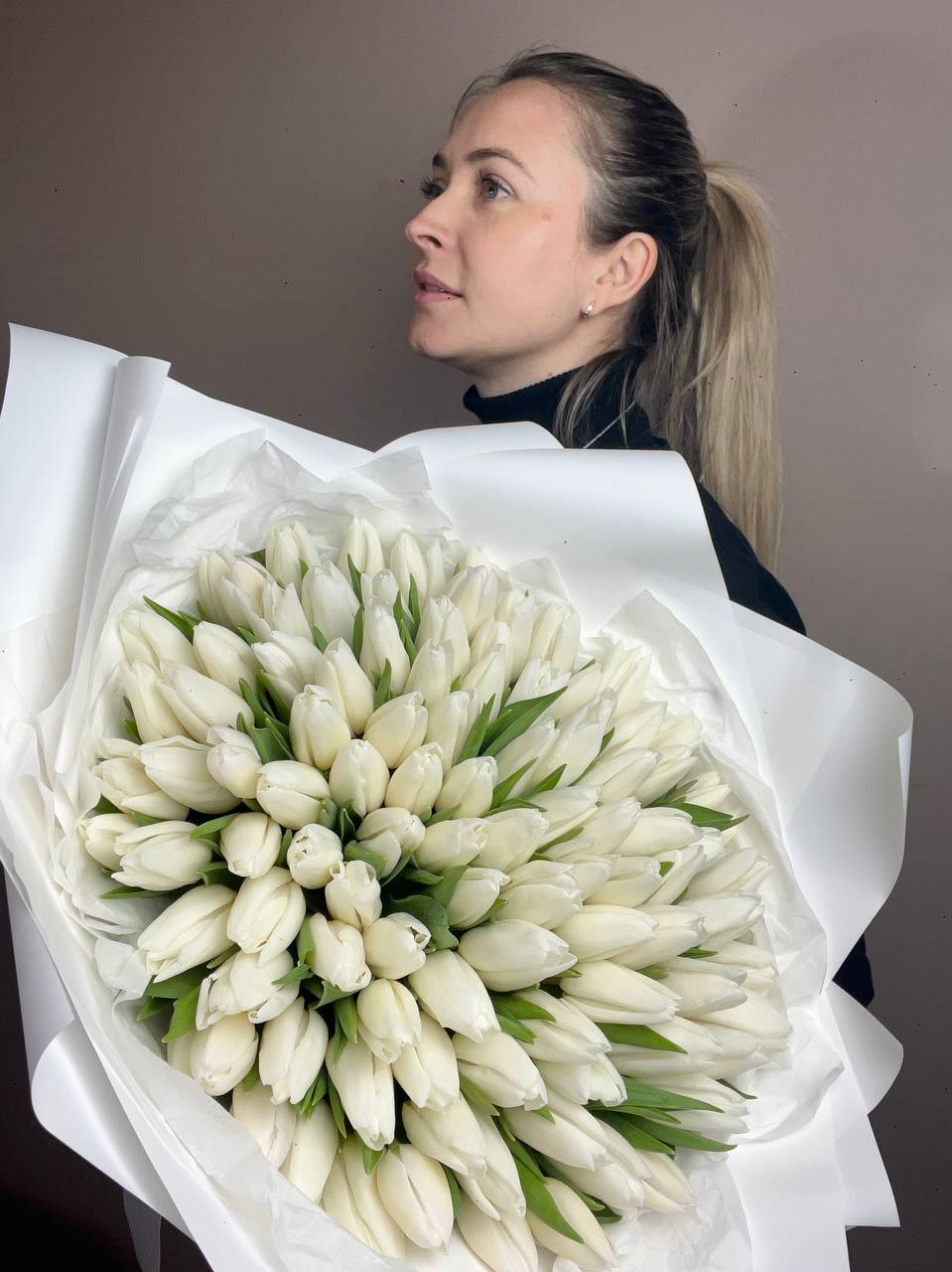 Сто один белоснежный бутон собран в монохромную композицию впечатляющего объема. Плотная сборка создает графичный силуэт, который заполняет пространство светом и весенней свежестью.