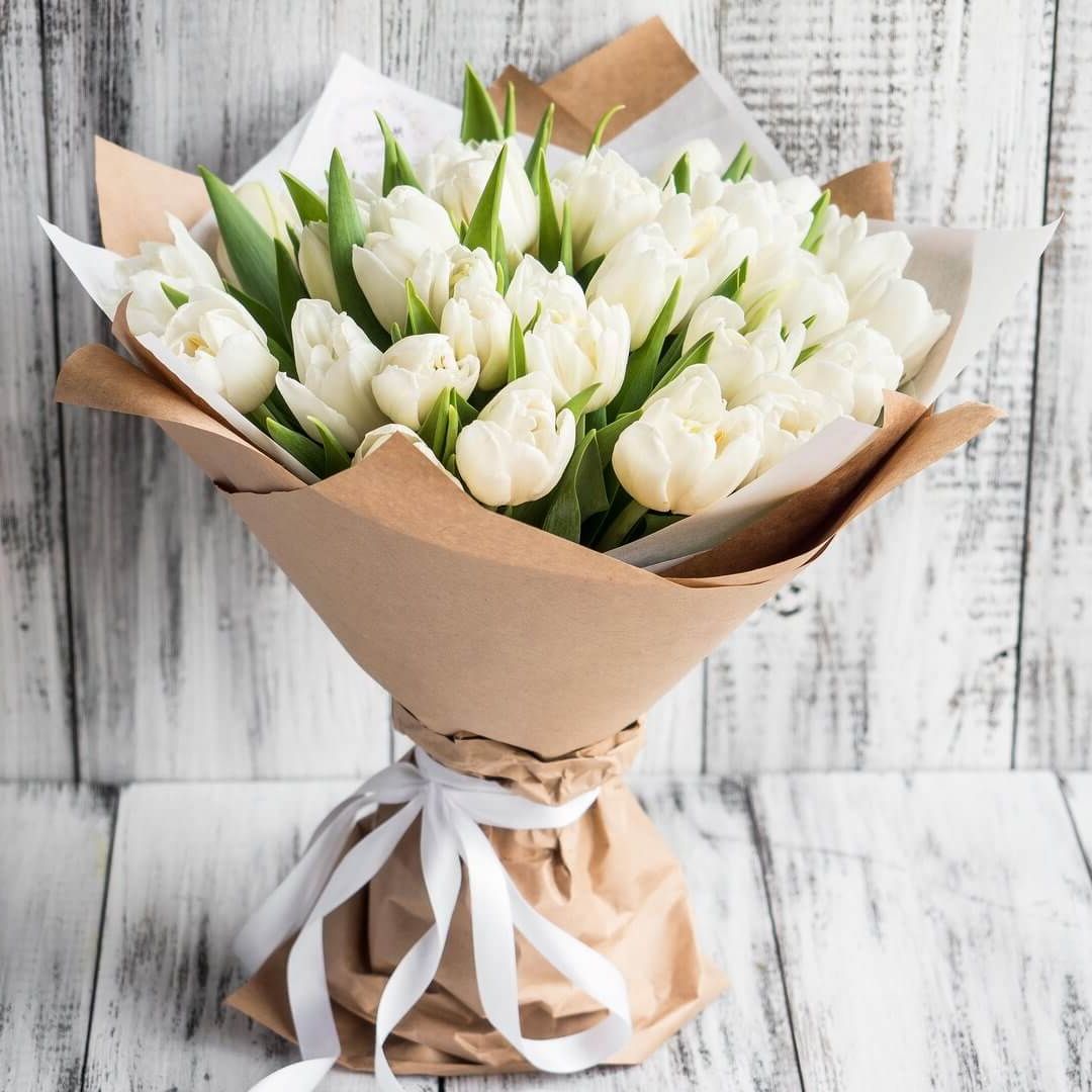 25 белых пионовидных тюльпанов, лента, крафт и белая пленка.
