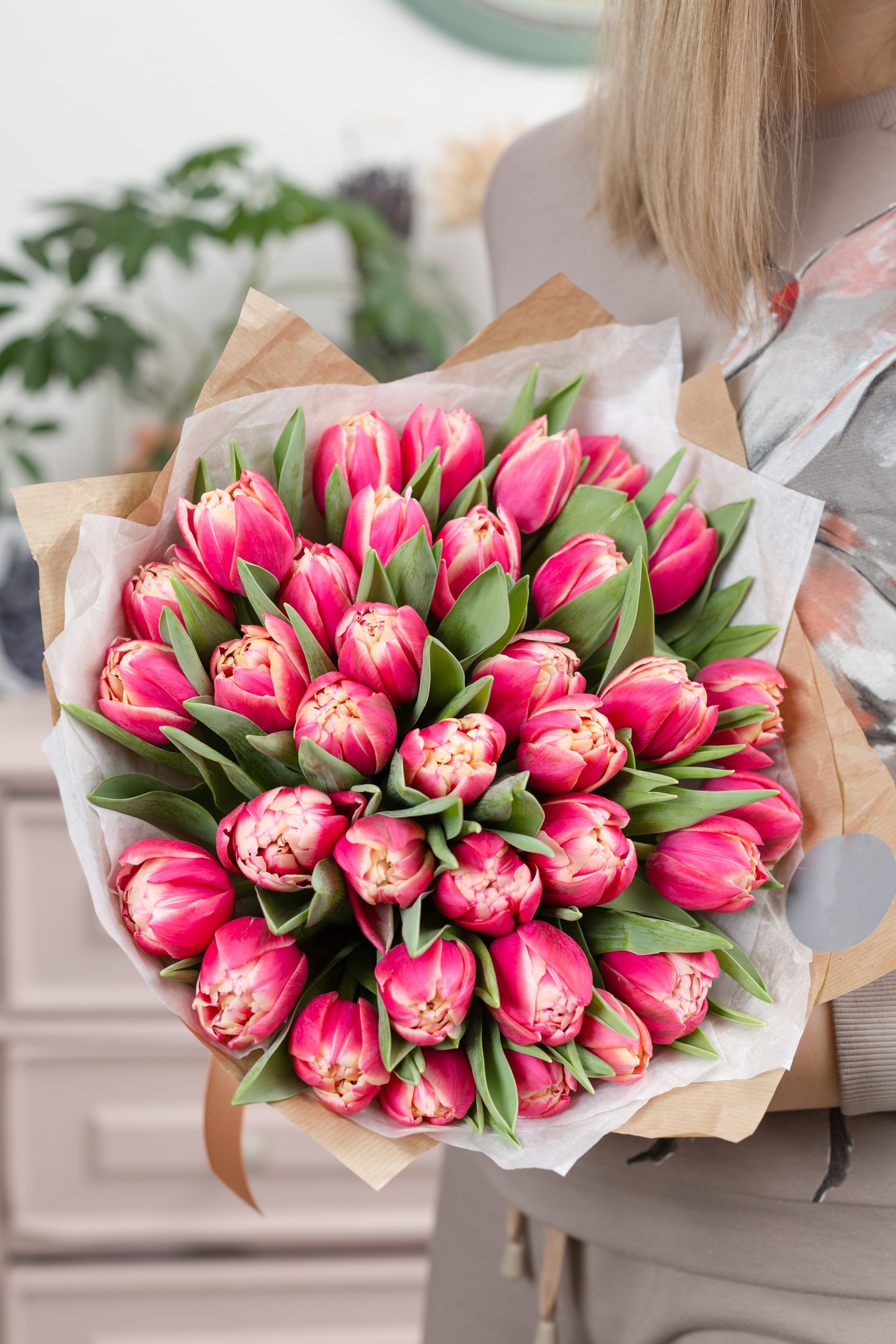 изначальная цена указана за букет из 15 тюльпанов Состав букета на фотографии: 35 тюльпанов, лента, упаковка Вы можете выбрать желаемое количество роз в данном букете.