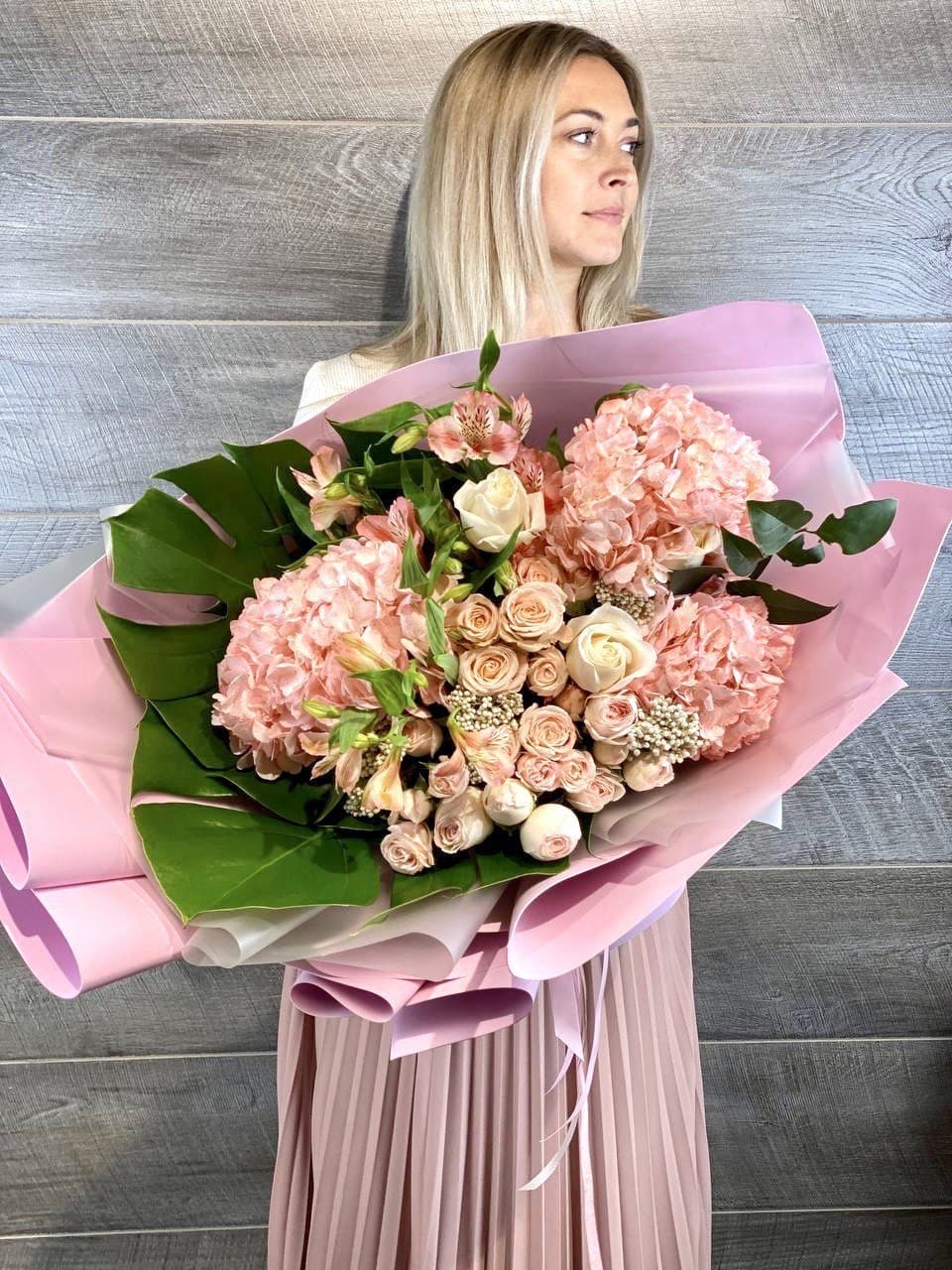 Valencia объединяет пышные соцветия гортензии с многослойными розами и воздушной эустомой. Крупные листья монстеры создают графичный каркас, а озотамнус добавляет текстурной глубины. Композиция для пространств, где ценится авторский взгляд на флористику.