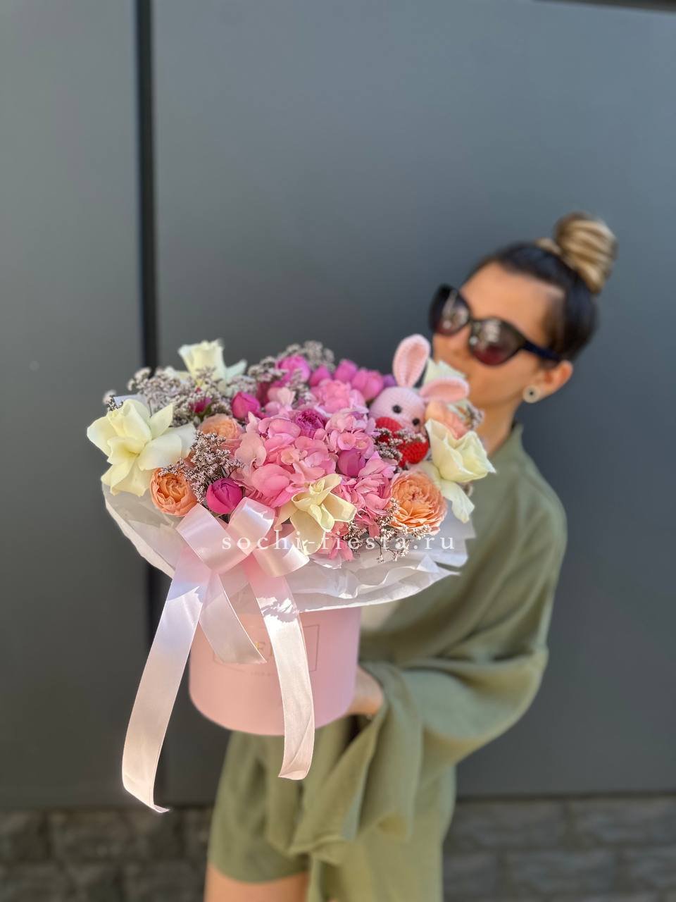 Композиция в цилиндре объединяет одноголовые и кустовые розы с пышной гортензией. Лимониум добавляет воздушности. Мягкая игрушка завершает образ.