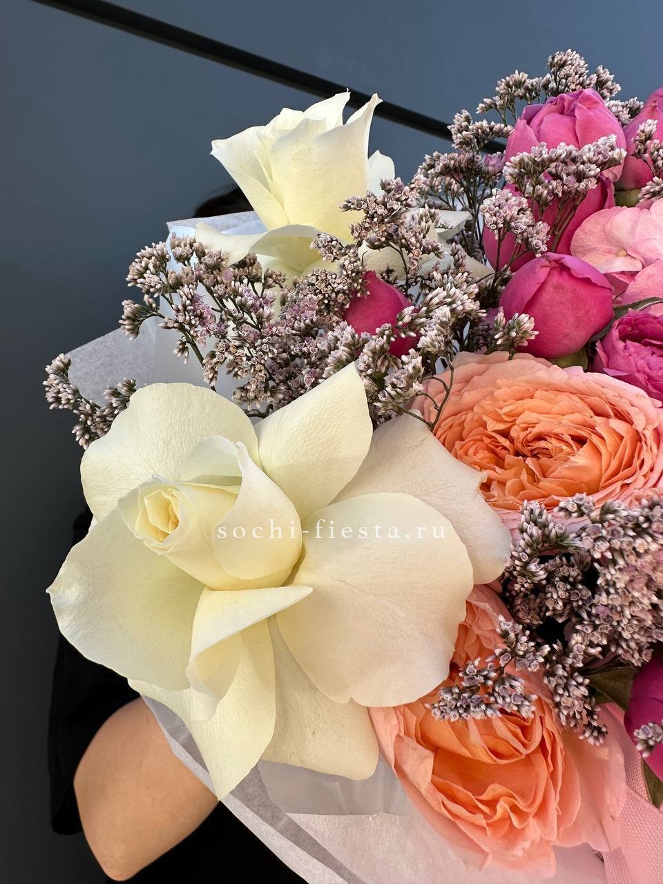 одноголовые розы, кустовые розы, гортензия, лимониум, лента, цилиндр D16.
