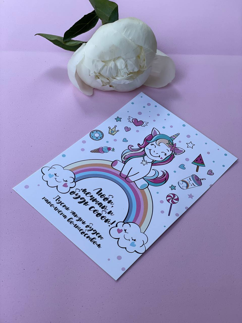 Карточка с мечтательным единорогом в пастельных тонах готова передать ваши слова. Сказочный персонаж и мягкая палитра добавляют капельку волшебства к любому букету.
