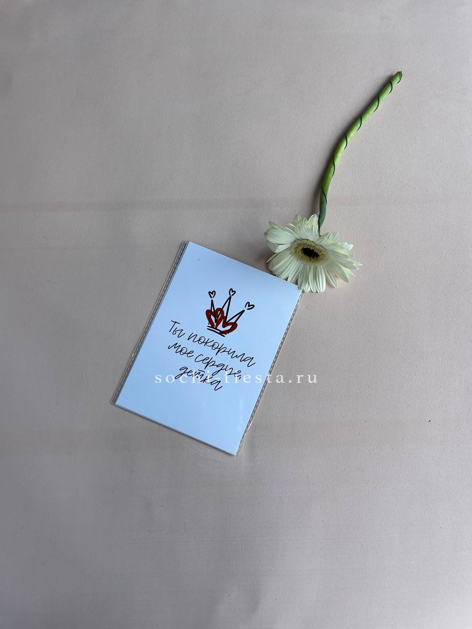 Карточка с праздничной надписью превращает момент вручения в запоминающуюся историю. Внутри разместится ваше послание объемом до семи предложений. Радость зафиксирована на бумаге.