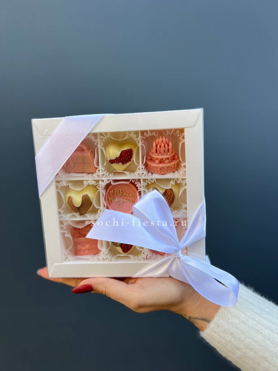 Хрустящий миндаль и фисташки встречаются с нежной клубникой под слоем белого бельгийского шоколада. Каждая конфета создана вручную и собрана в коробку диаметром 15 см. Яркий акцент для праздничного стола.