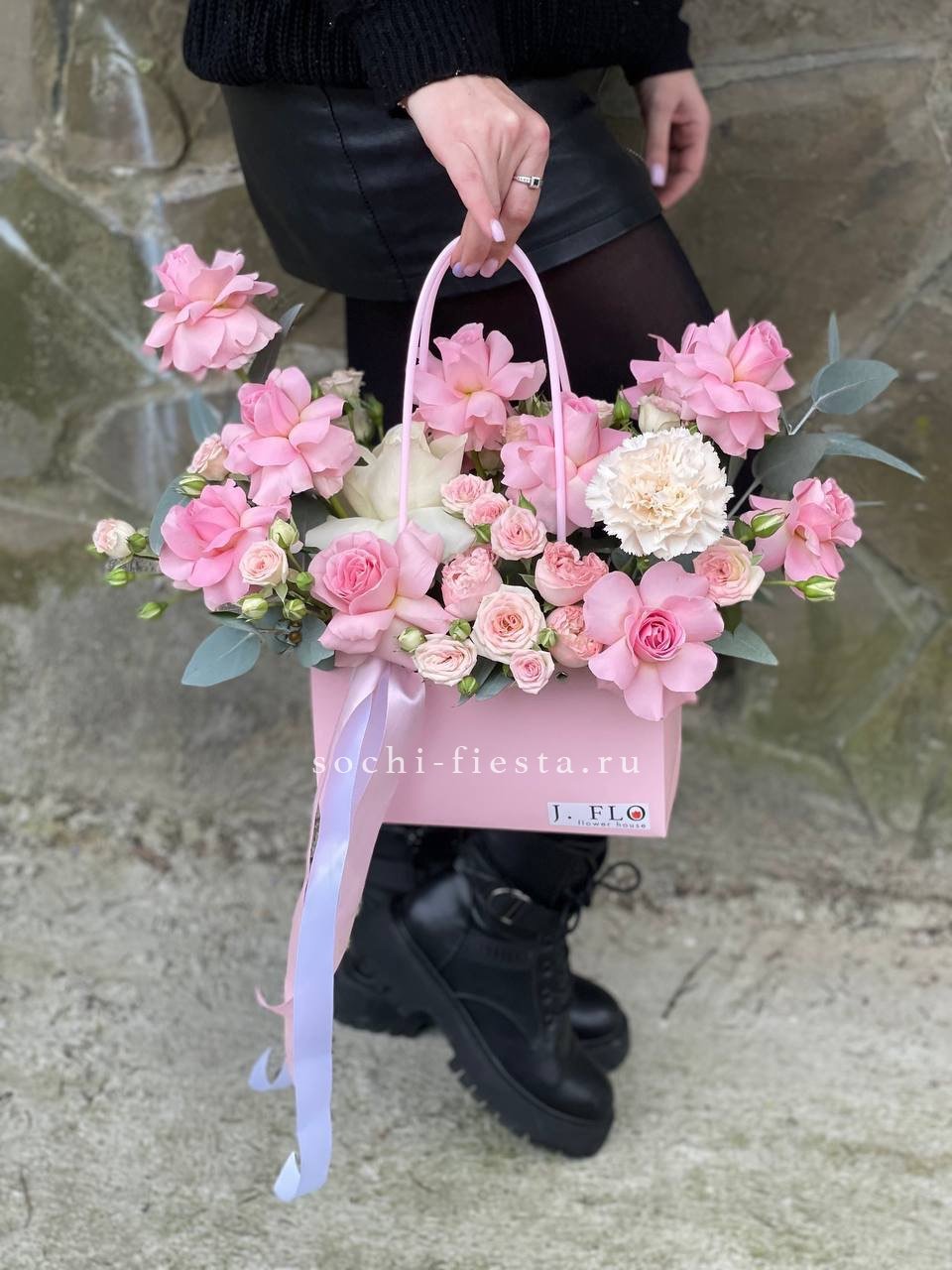 розовая роза, пионовидная роза, диантус, эвкалипт, лента, сумка-кашпо.