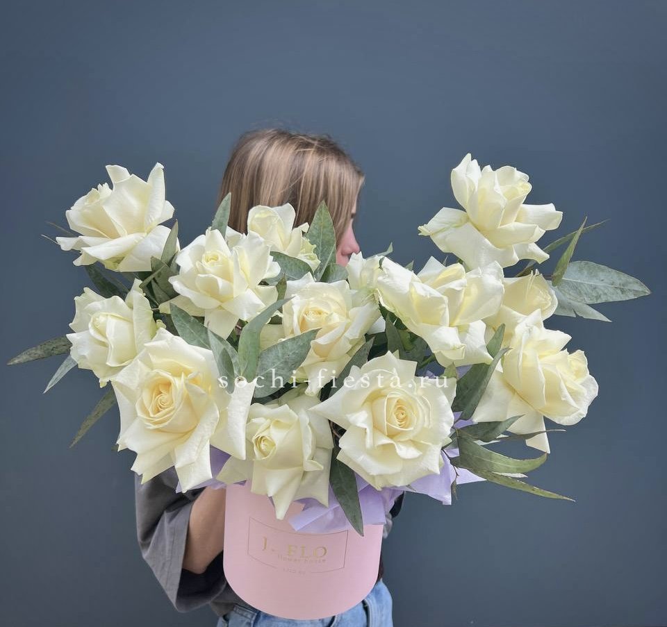 вывернутые белые розы, цилиндр D16, эвкалипт, лента, упаковка.