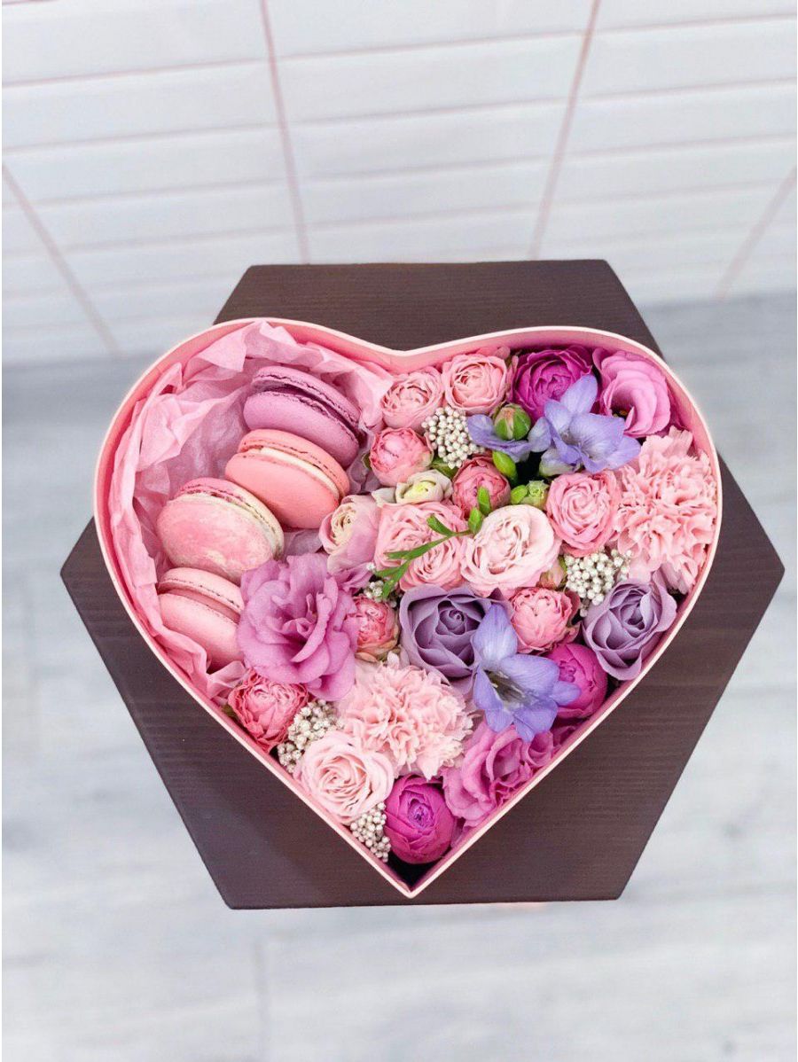 комбинация цветочных элементов нежных оттенков, клубника, коробка в форме сердца.