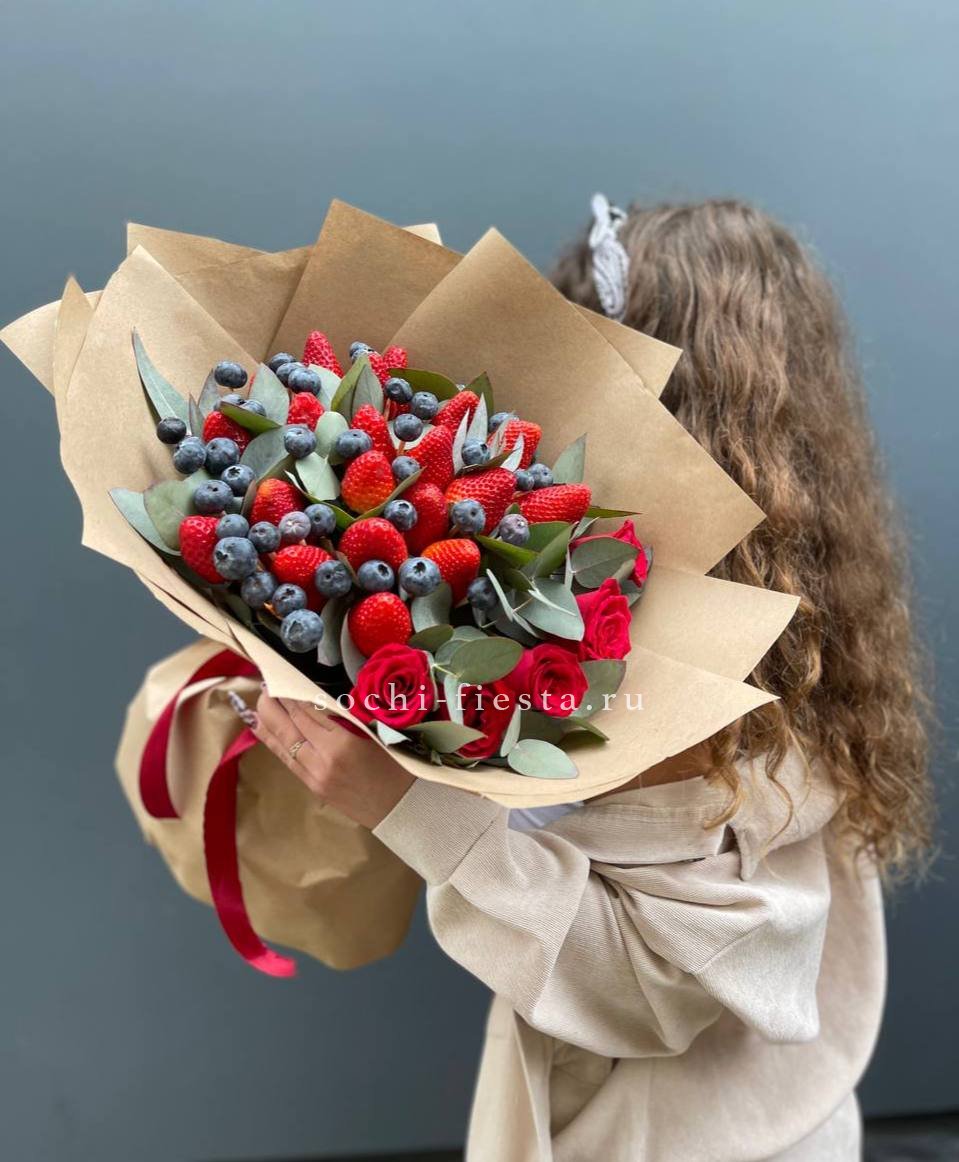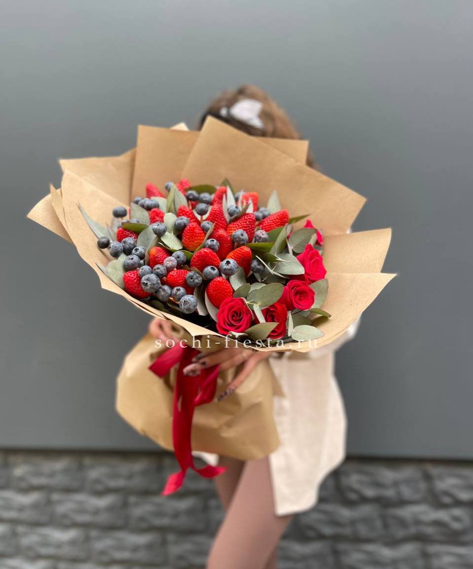 красные розы- 5 шт., ароматная клубника - 500-600 г., голубика - 100 г., фисташка или эвкалипт, лента, крафт.
