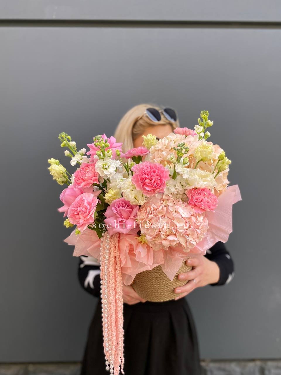 Пышная композиция объединяет розовые оттенки гортензии, роз, маттиолы и эустомы с акцентами диантуса и амаранта. Насыщенная фактура и плавные переходы цвета создают объёмное живописное полотно в натуральном кашпо.