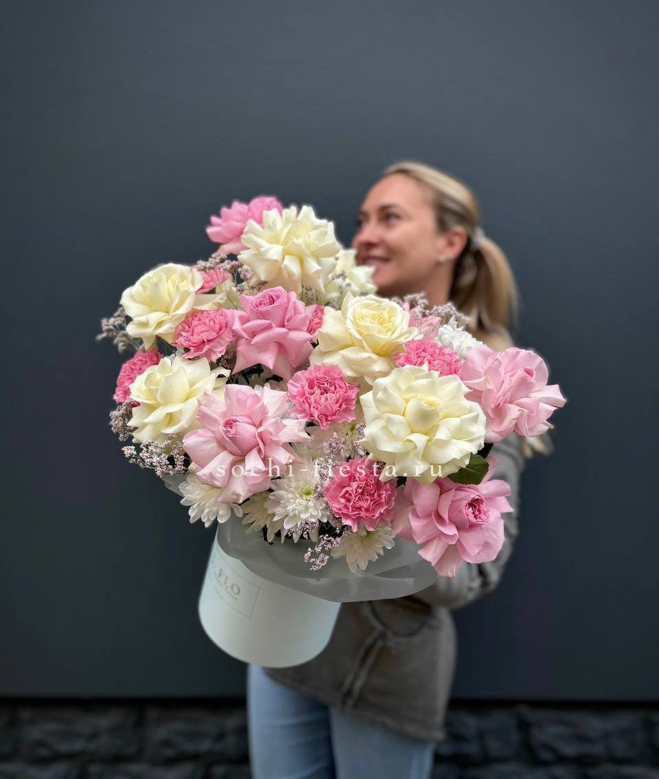Для заказа товара "Коробка французских роз и диантусов "Бони"" с доставкой в Чебоксарах нажмите в корзину