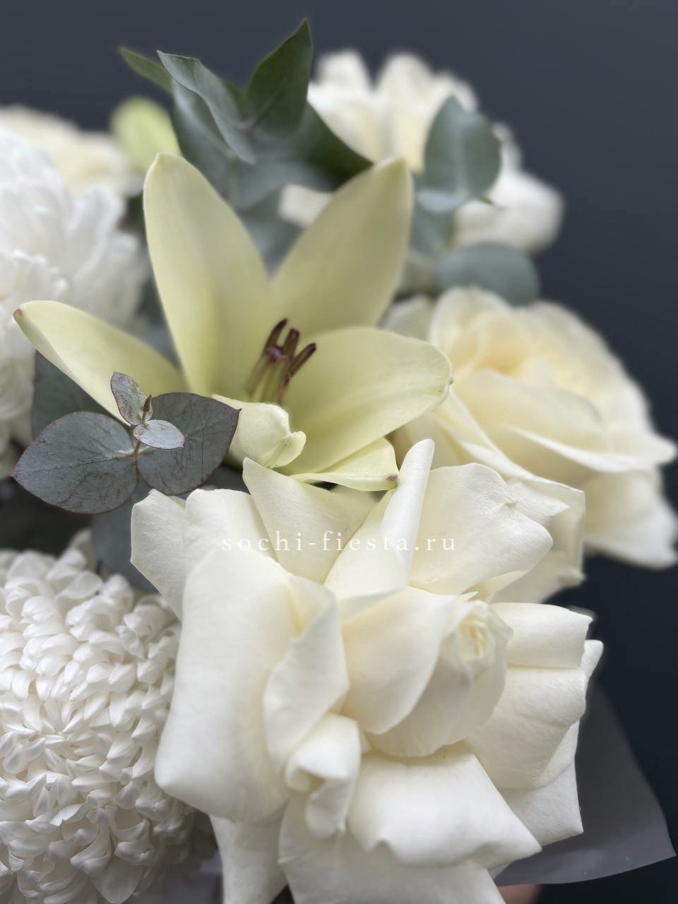 Белые французские розы раскрываются крупными бутонами и соседствуют с воздушной эустомой. Композиция создает ощущение легкости и света.