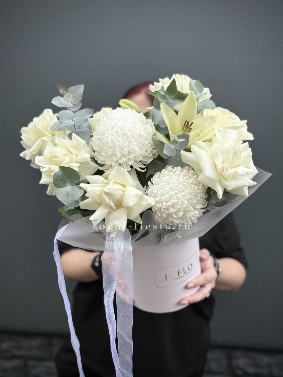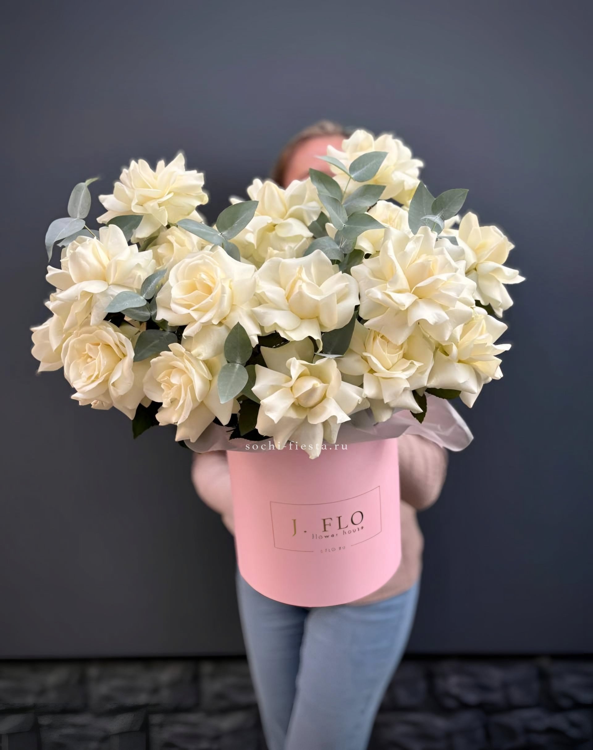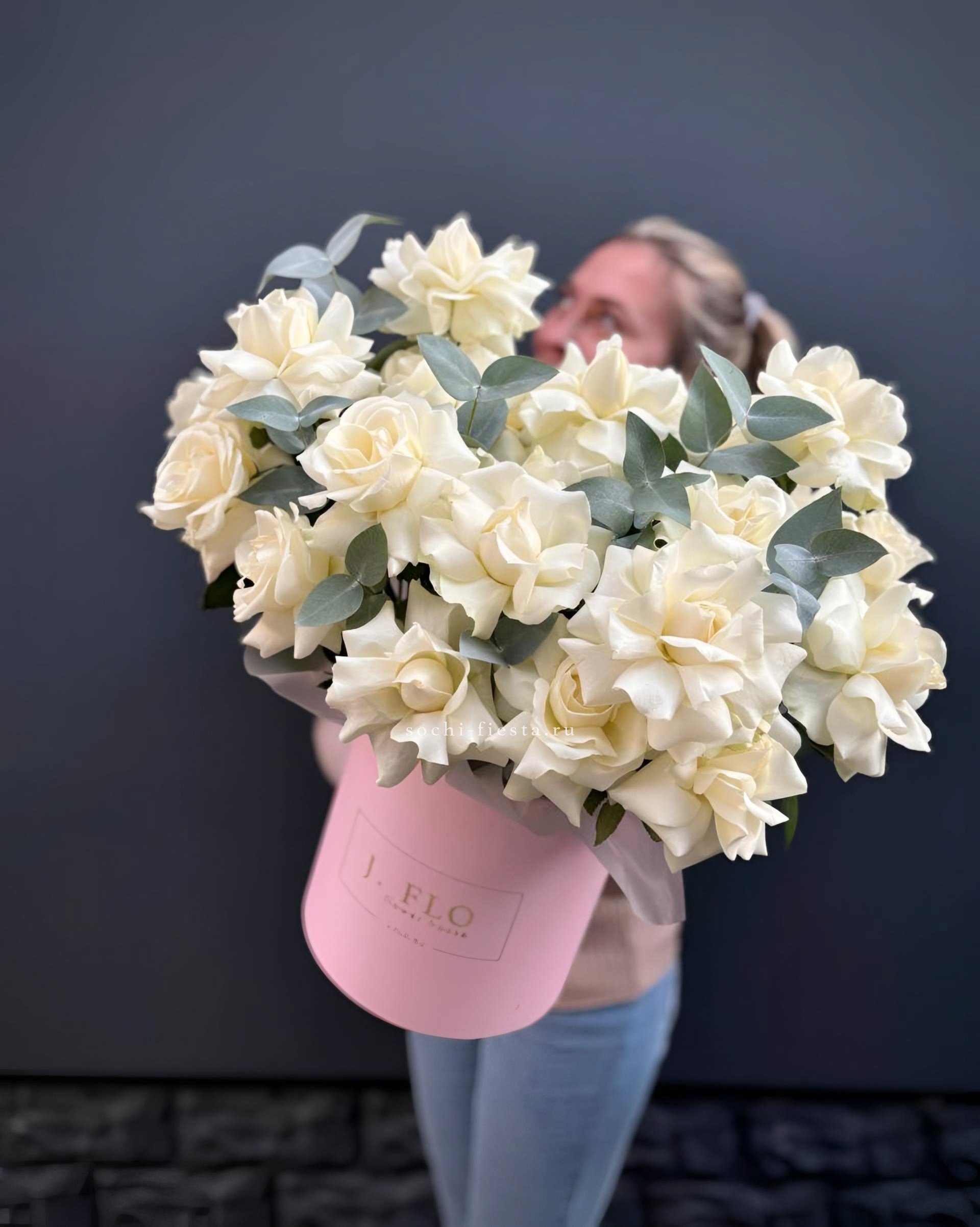 бокс 20D, белая французская роза, эустома, эвкалипт.
