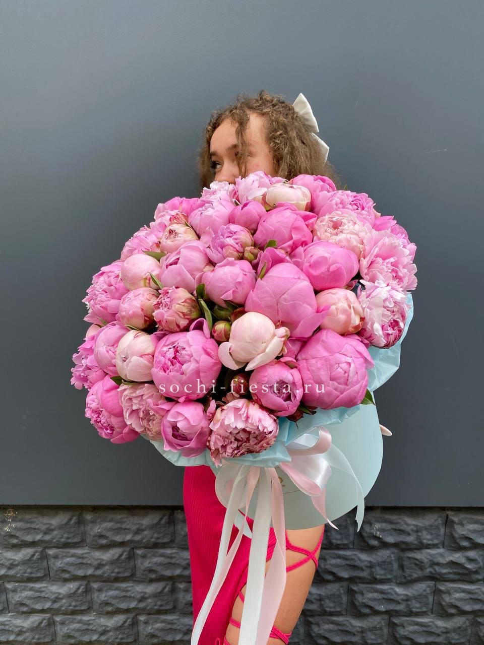 Пятьдесят один пион в одной композиции — это объём, который заполняет собой всё вокруг. Бутоны плотно уложены в цилиндр, создавая эффект цветочного облака. Такой масштаб запоминается с первого взгляда.