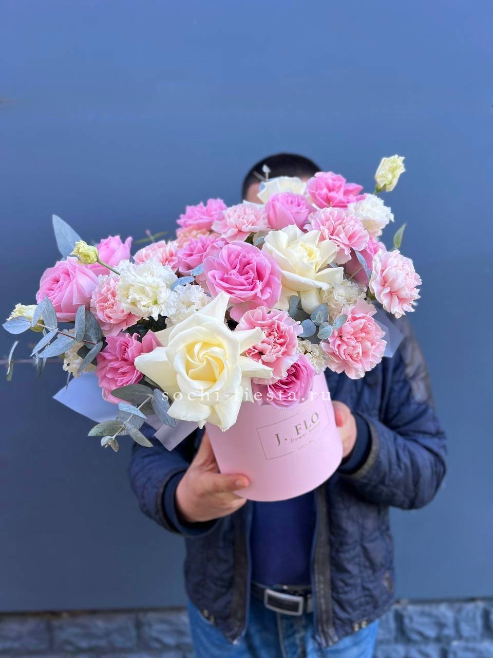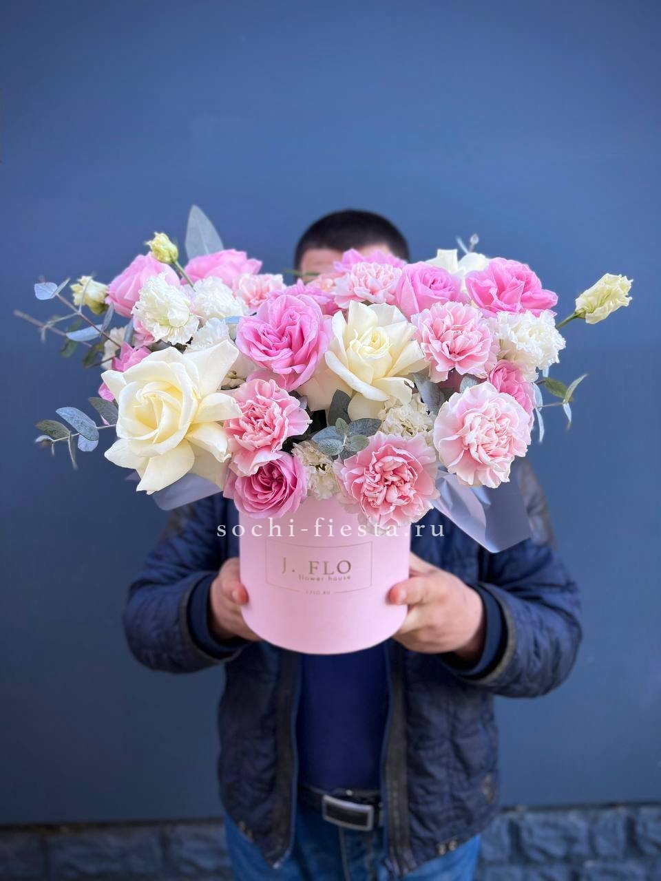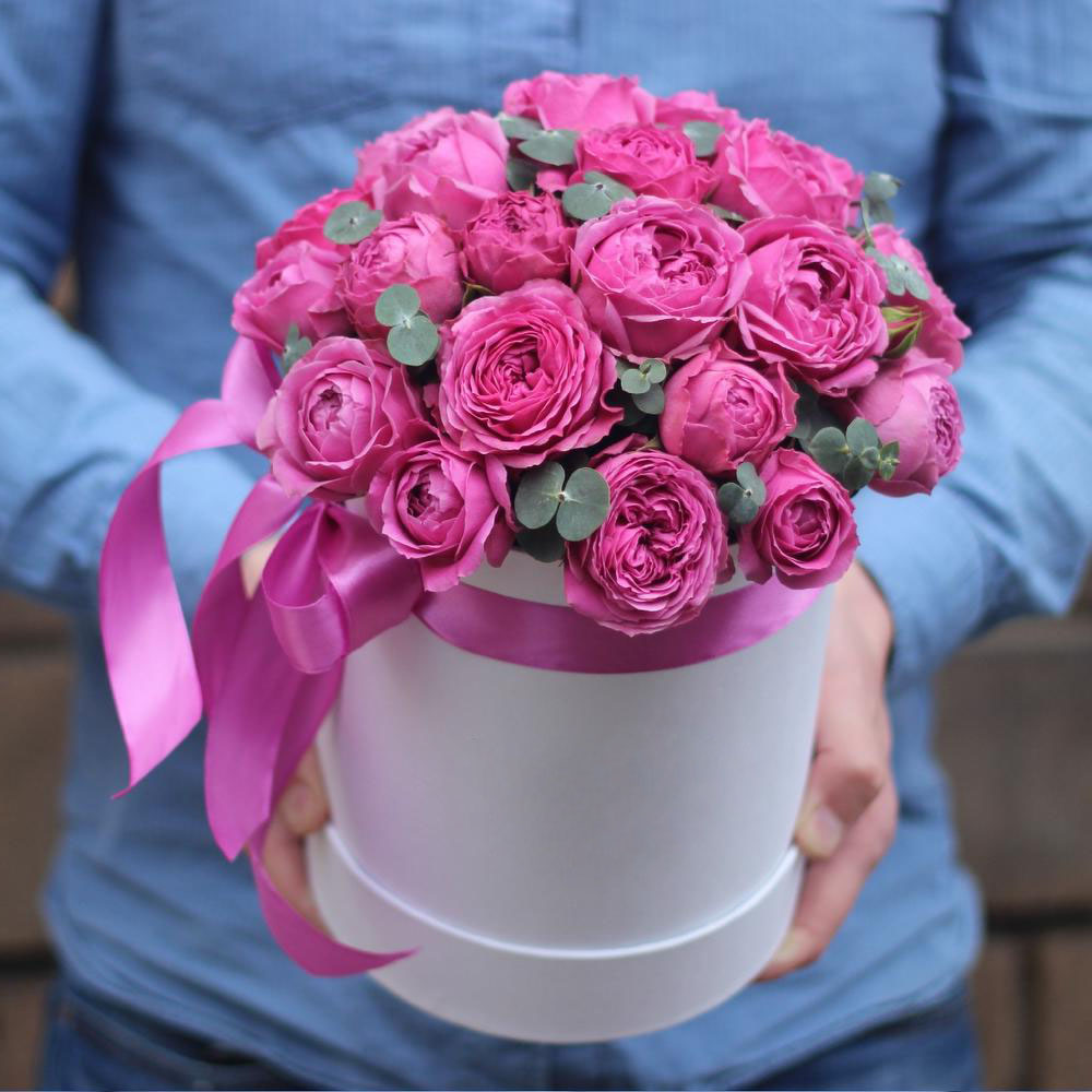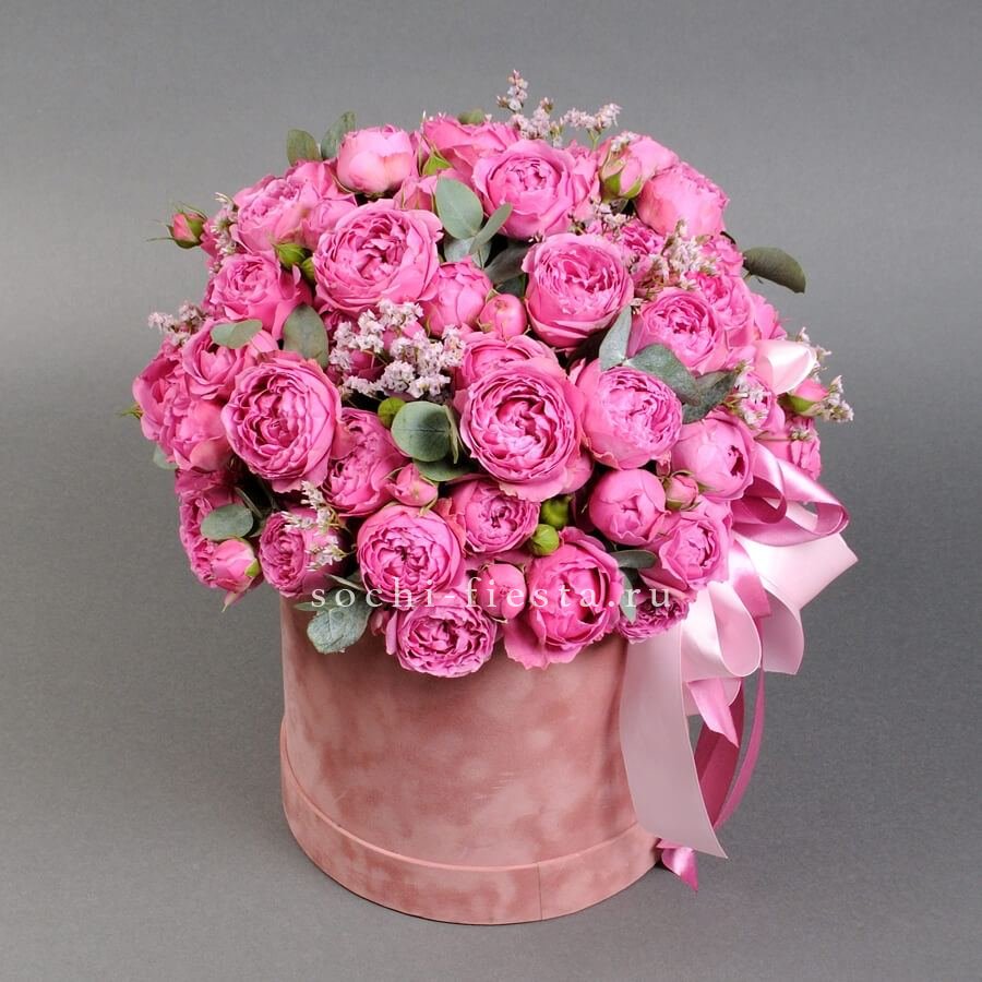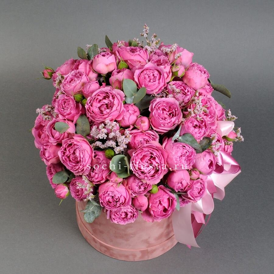 Гортензия и пионовидные розы задают плотную основу, маттиола или дельфиниум вытягивают композицию вверх. Объемная коробка вмещает многослойную структуру из разных форм и высот.