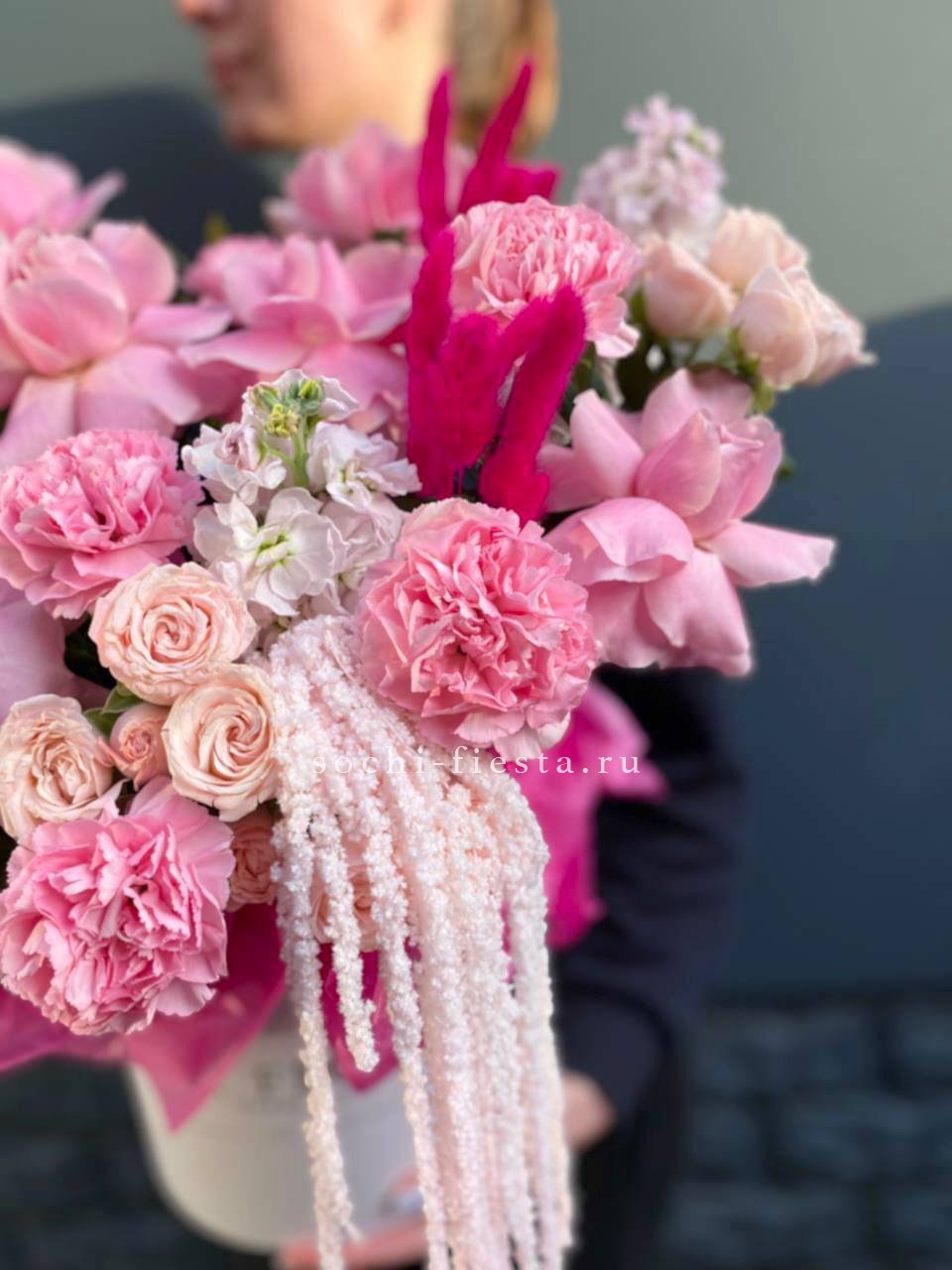 Воздушная композиция в пастельной гамме с акцентом на фактуру раскрытых бутонов. Пионовидные розы и эустома создают объёмный силуэт, а хлопок добавляет графичности.
