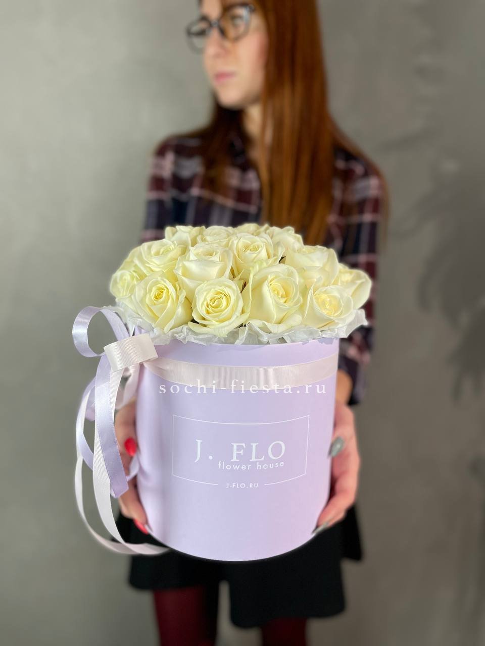 Пятнадцать роз Мандала в боксе образуют плотную шапку с густыми многослойными бутонами. Нобилис добавляет фактурную глубину и завершает композицию.