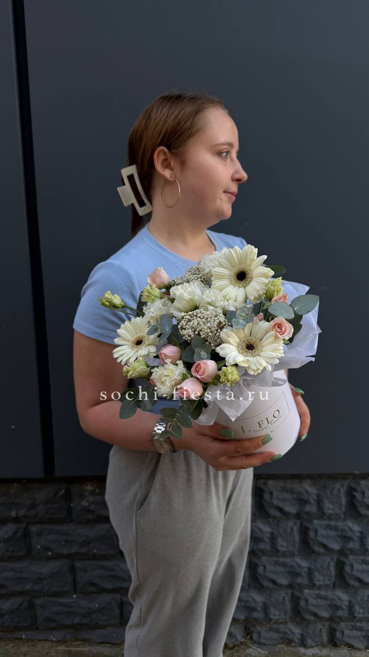 Яркие герберы и кустовые розы собраны в плотную круглую форму. Эустома добавляет воздушности, а озотамус создает текстурный контраст между крупными бутонами. Композиция держит форму и выглядит празднично.