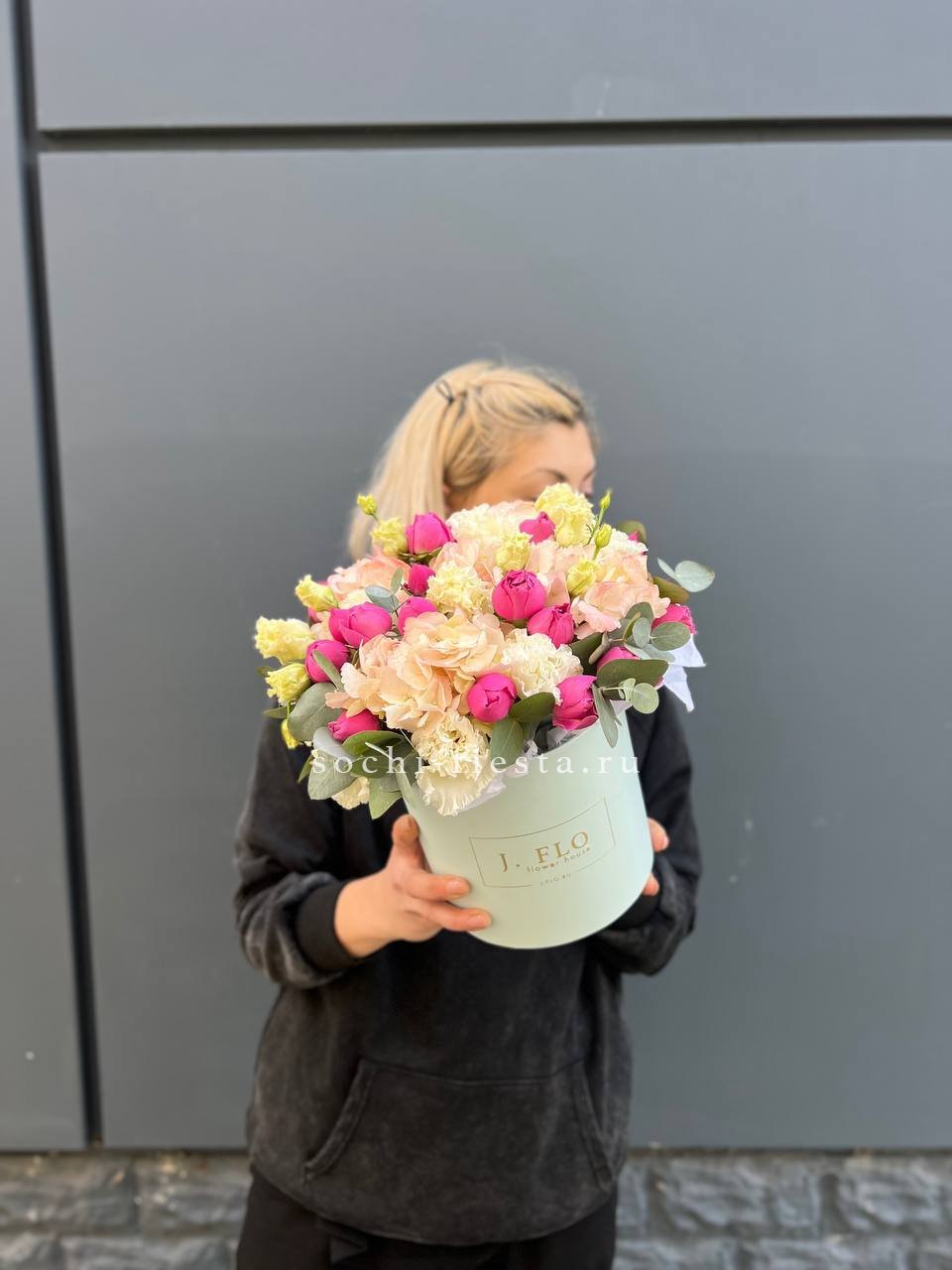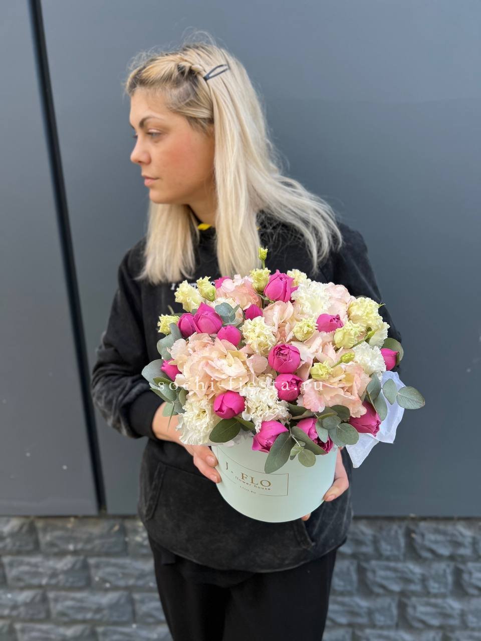 выполнен из гортензии, эустом, диантусов, французских роз, эвкалипт, цилиндр D20.