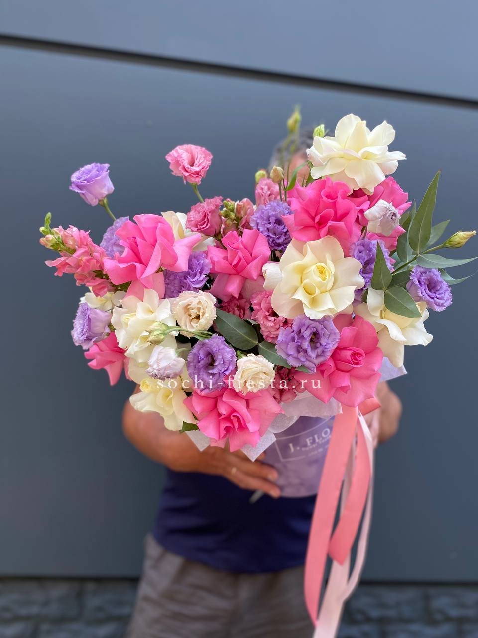 Розовые и белые розы переплетаются с фиолетовыми бутонами эустомы, создавая плавные цветовые переходы. Антиринум вытягивает силуэт вверх, а эвкалипт смягчает края.