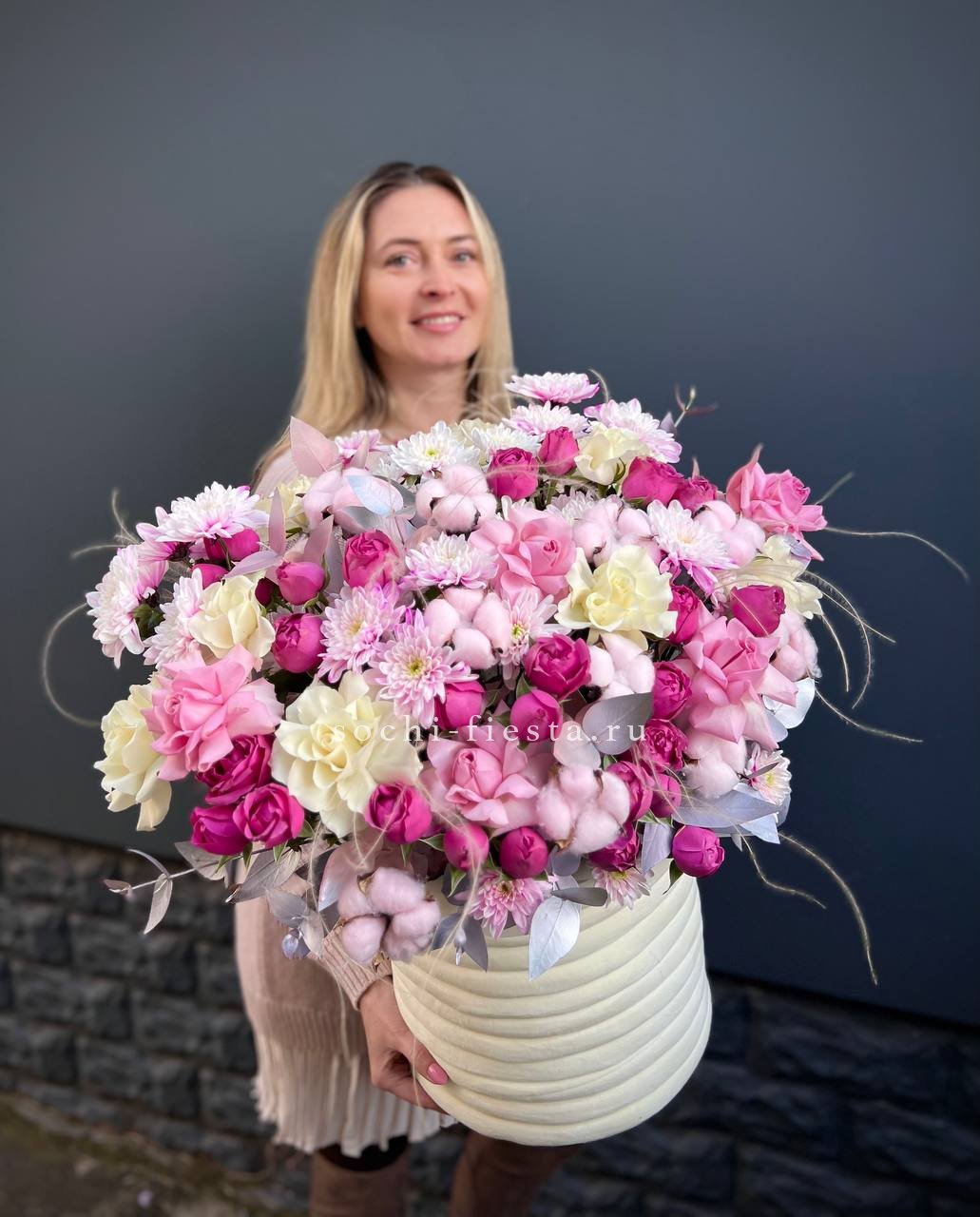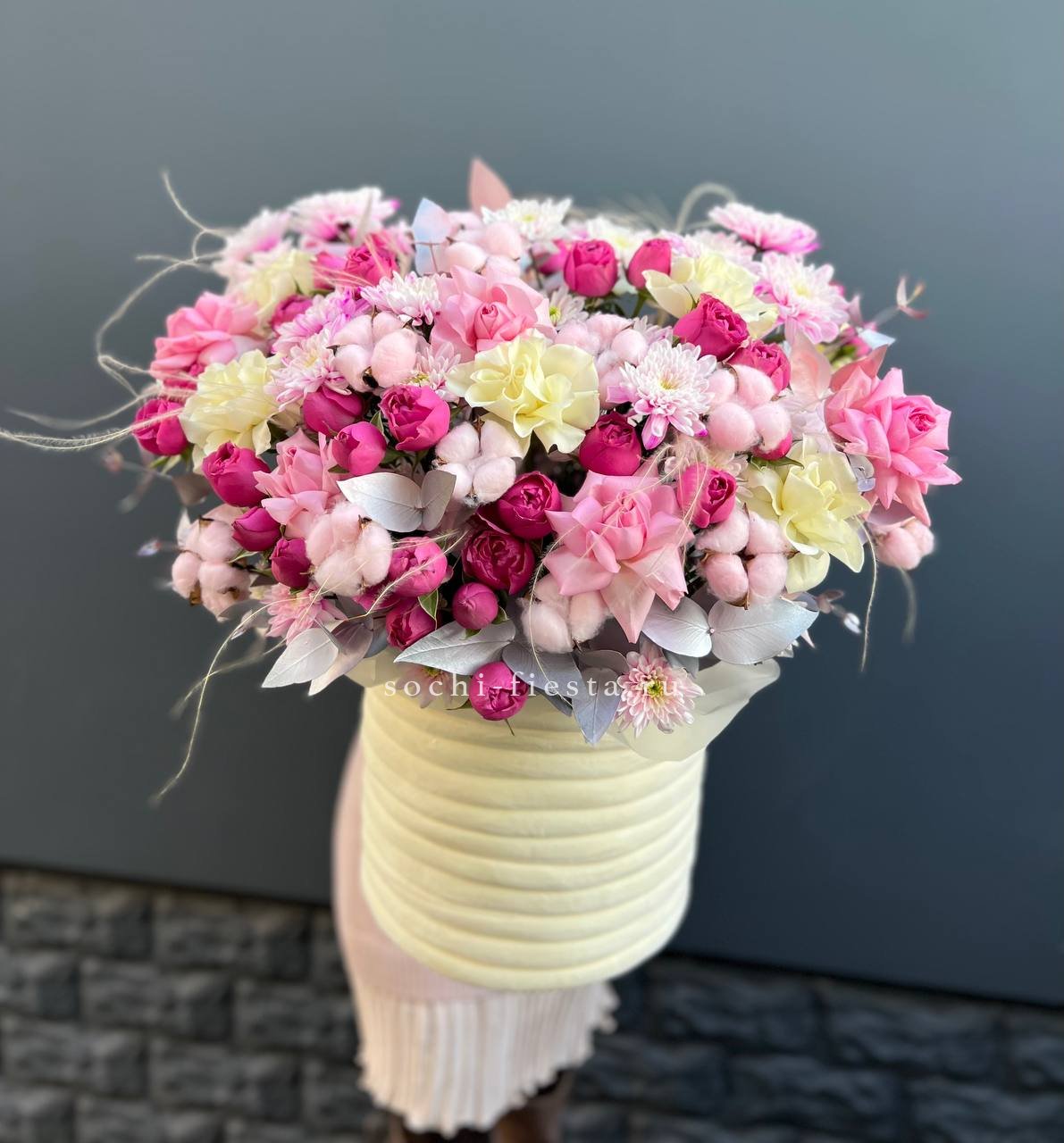Широкий бокс объединяет пионовидные розы с пушистыми головками хлопка и воздушными метелками ковыля. Композиция построена на слоях: плотные бутоны у основания переходят в легкие текстуры по краям.