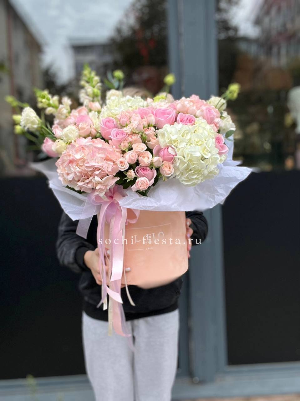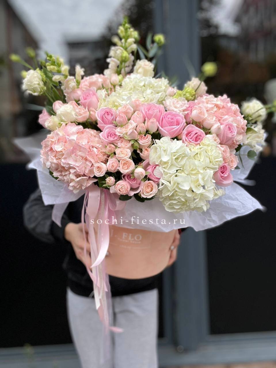 гортензия, розы пионовидные кустовые, эустома, эвкалипт, хамелациум, бруния, белая роза, цилиндр D16.