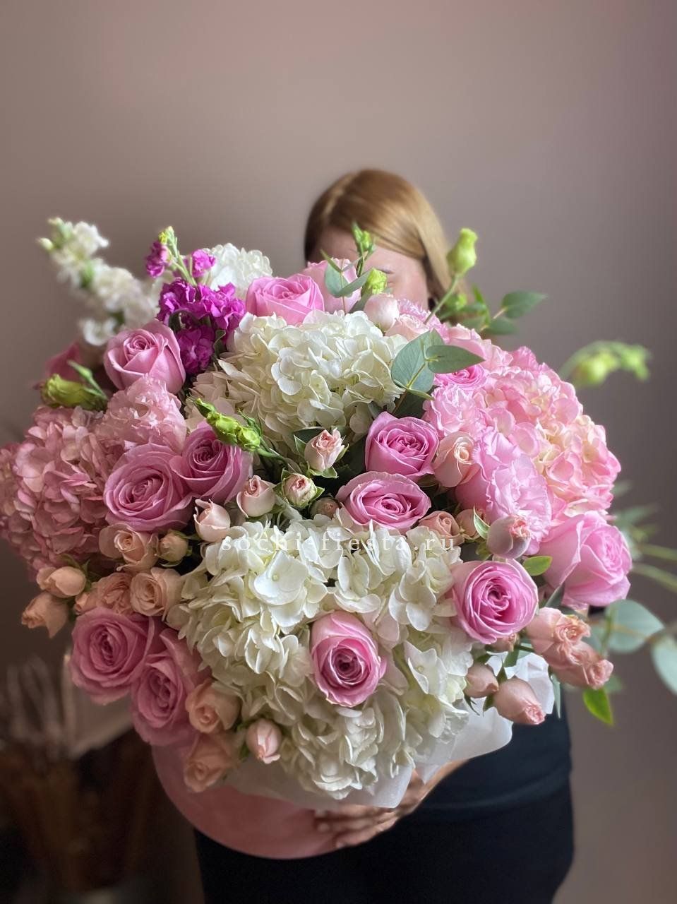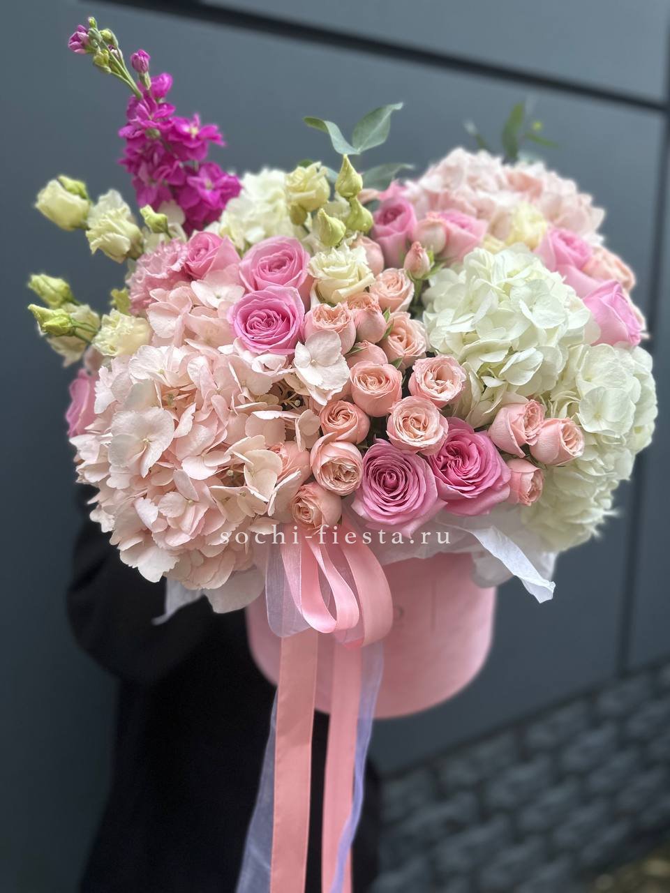 гортензия, кустовые розы, эустома, эвкалипт, лента, цилиндр D16.