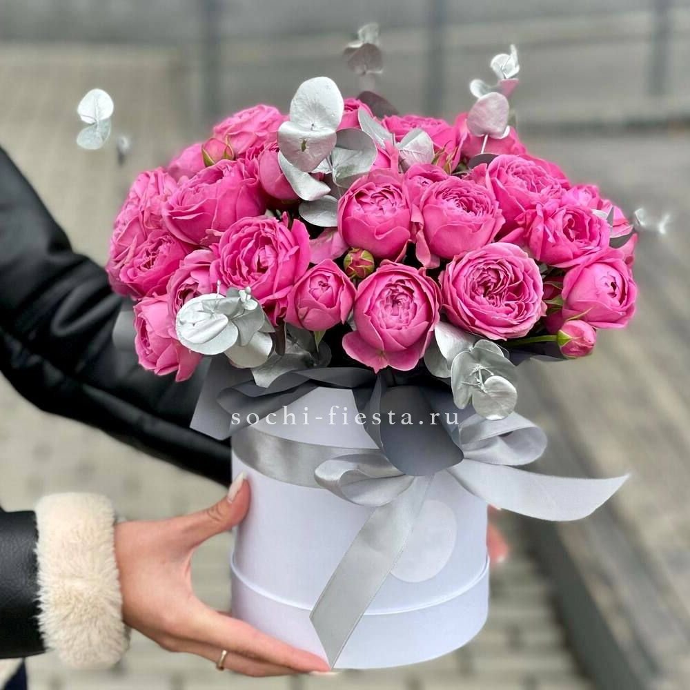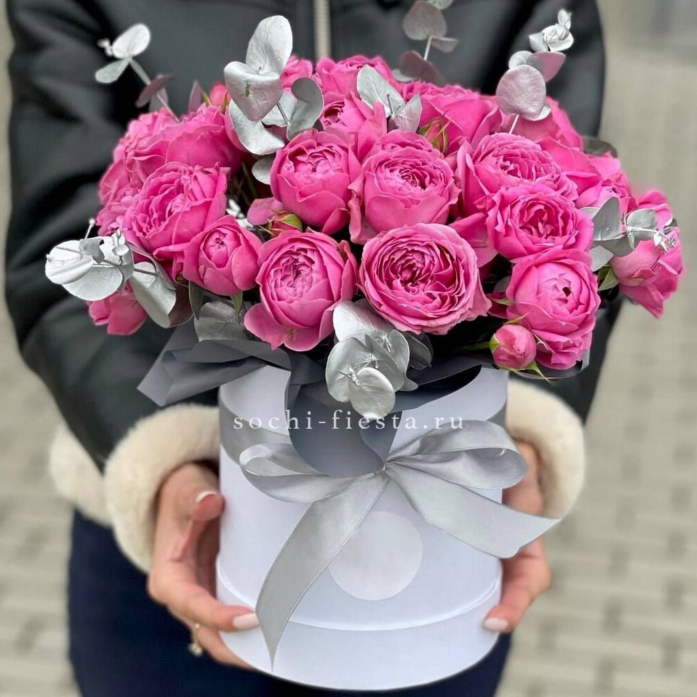 Гортензия создает пышную основу для французских роз и диантусов с эустомой. Цилиндр компактен и не требует дополнительной вазы. Розовая гамма раскрывается слоями от бледных до насыщенных оттенков.