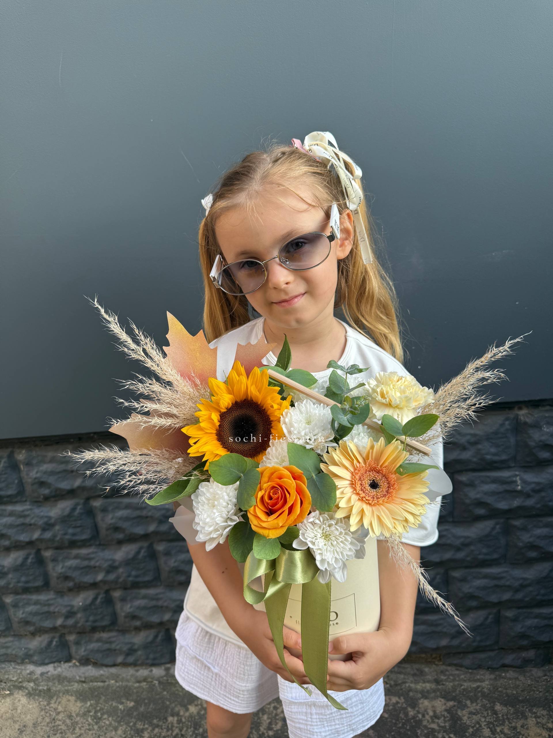 подсолнух, гербера, диантус, хризантема, роза, эвкалипт, декор, коробка D16.
