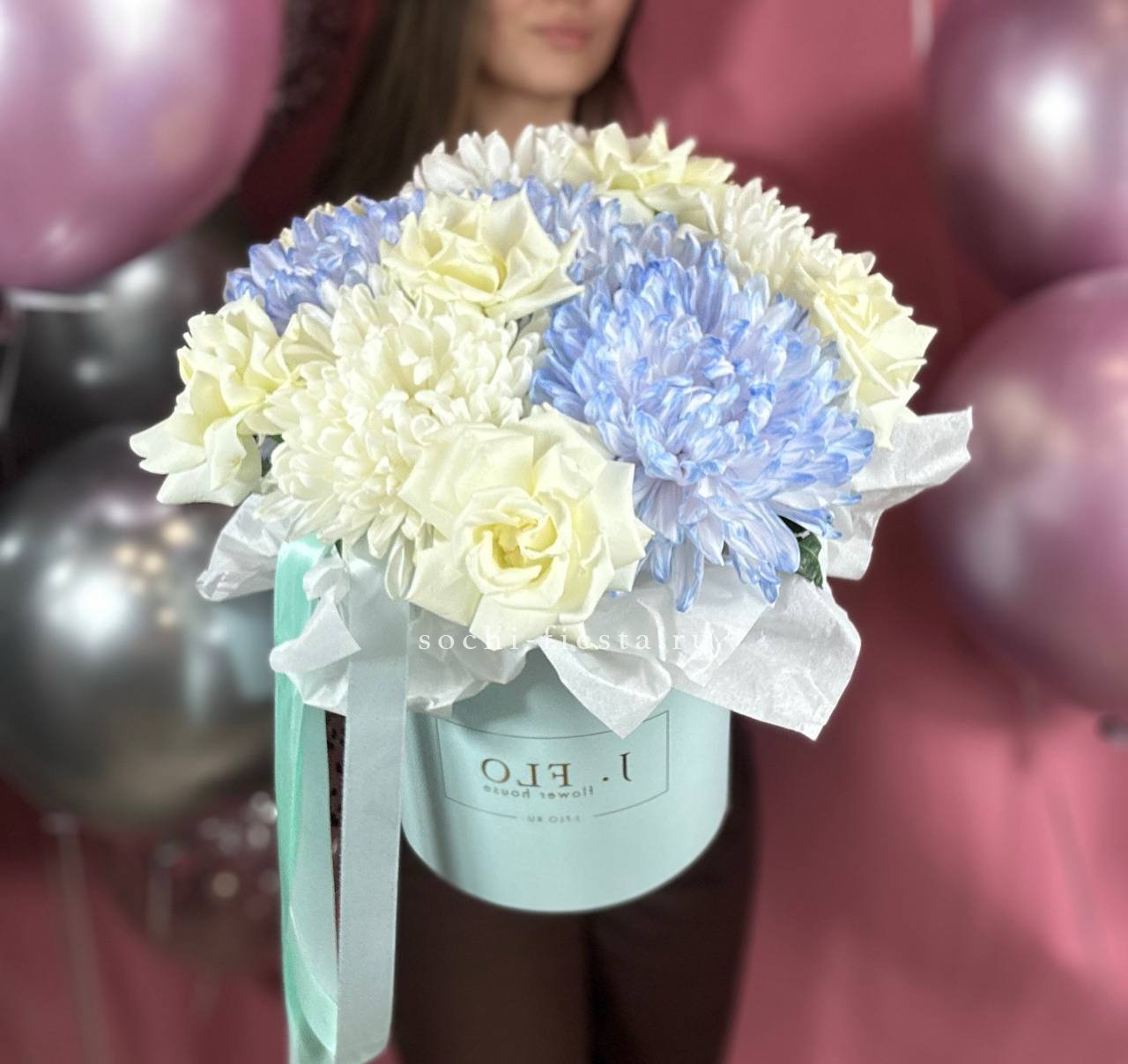 вывернутые белые розы, одноголовые хризантемы, цилиндр D20, лента.