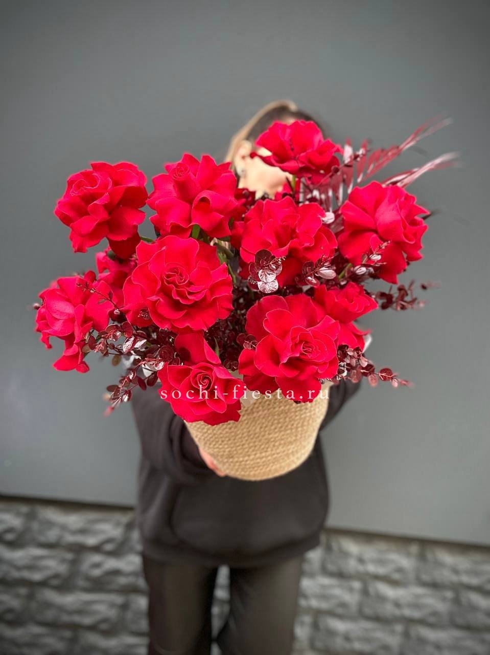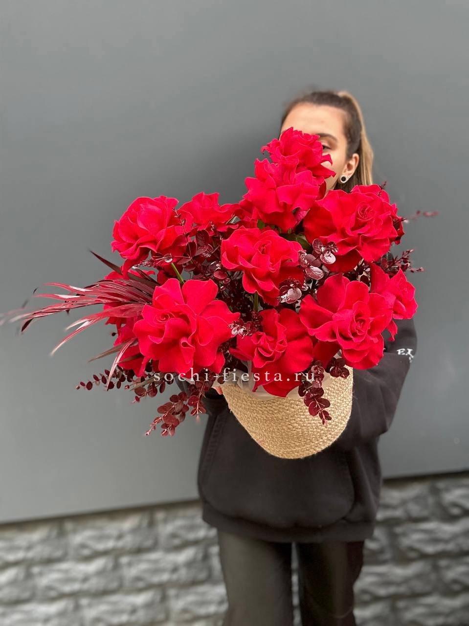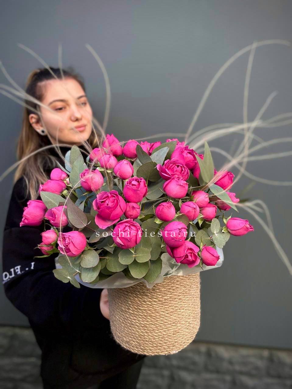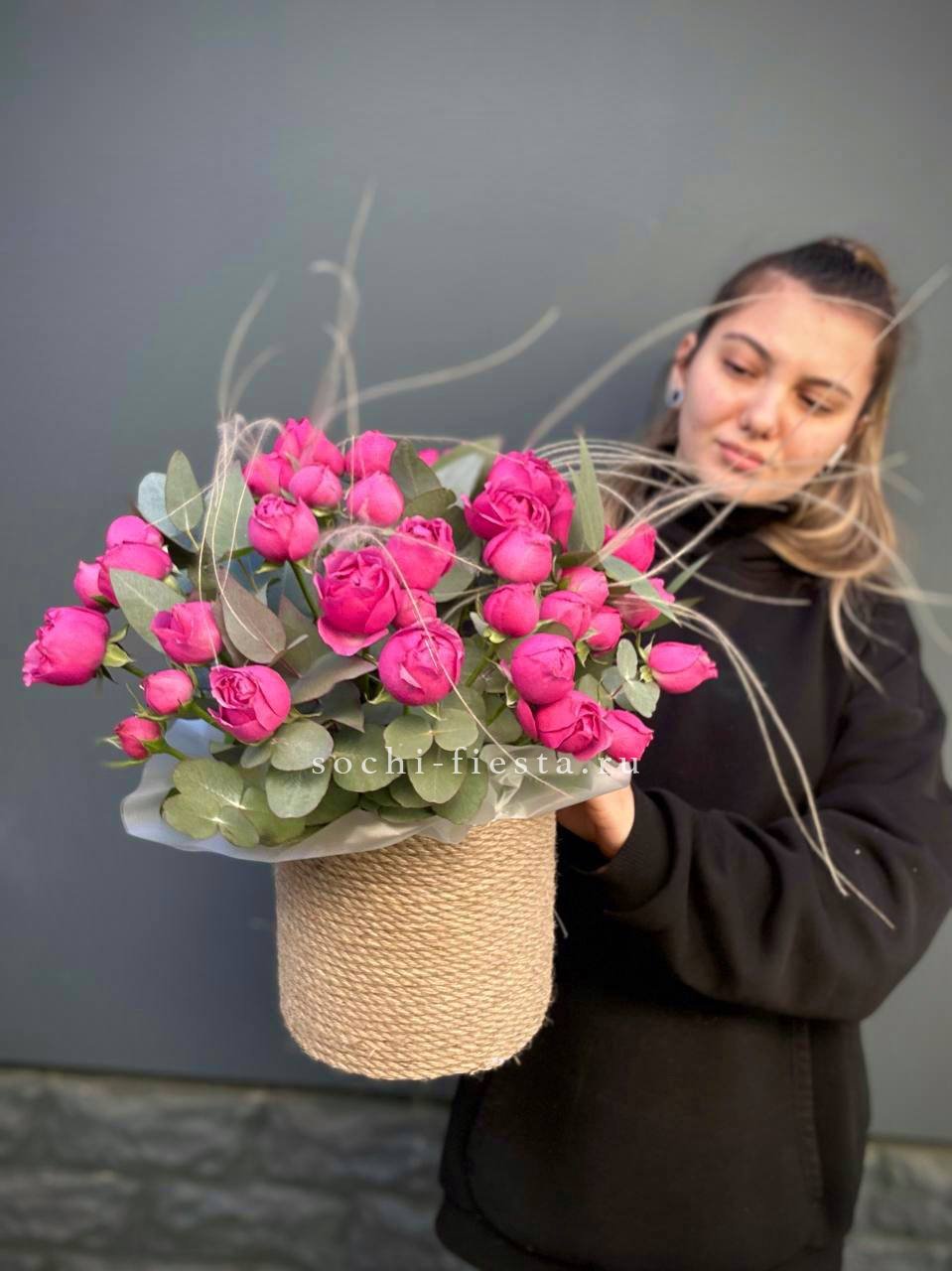роза французская, эвкалипт, лист Чико (аналог), джутовое кашпо, оазис.