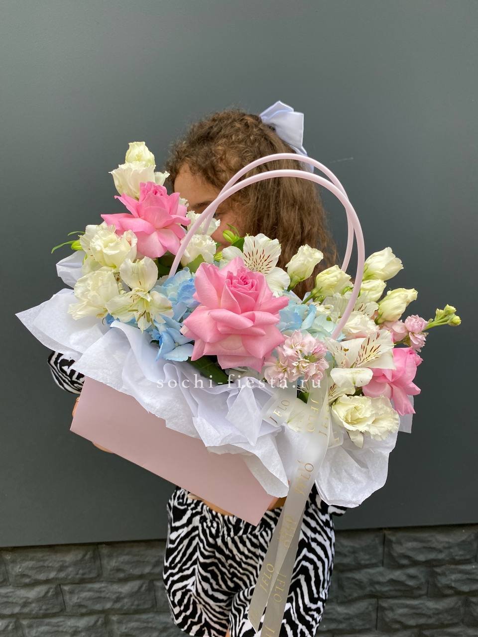Альстромерии и эустомы создают воздушную текстуру, а розовые розы добавляют композиции яркости. Сумка-кашпо делает презентацию удобной и готовой к вручению без дополнительных хлопот.