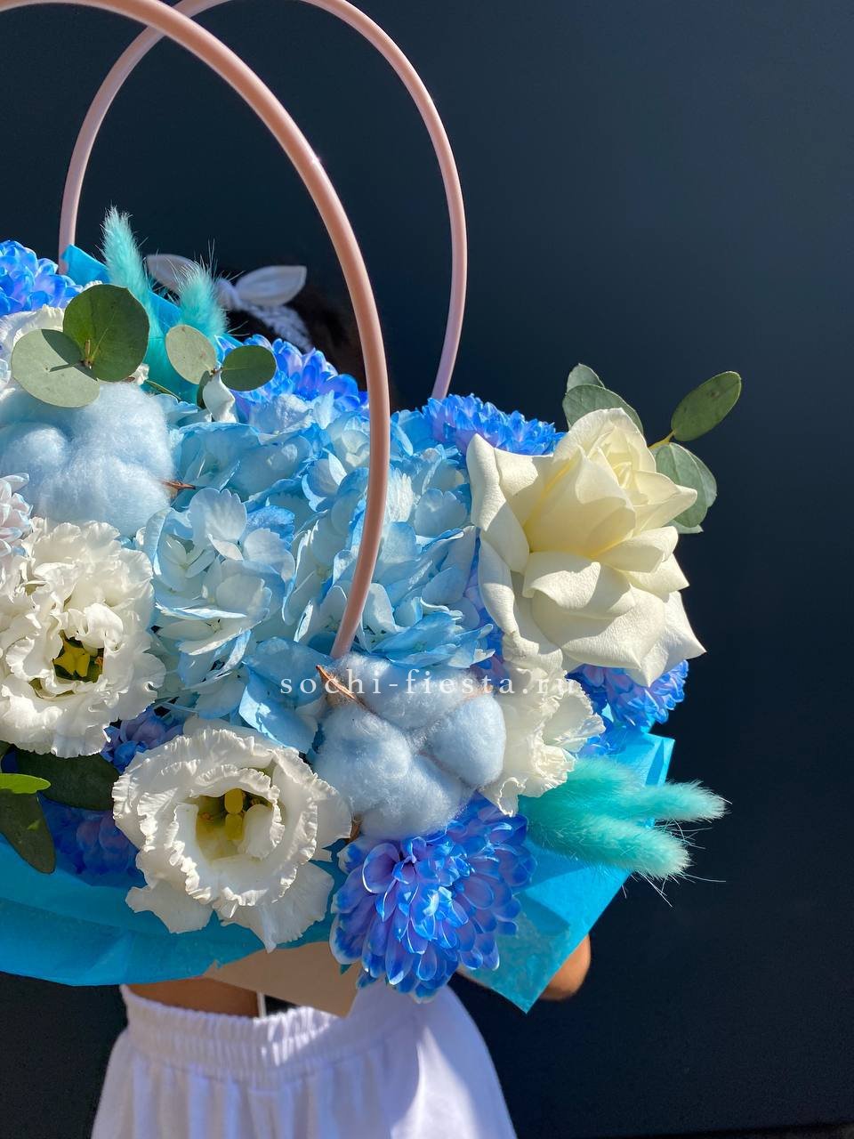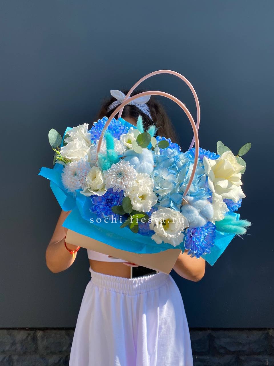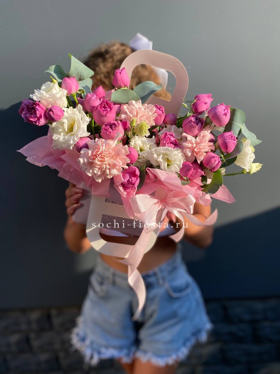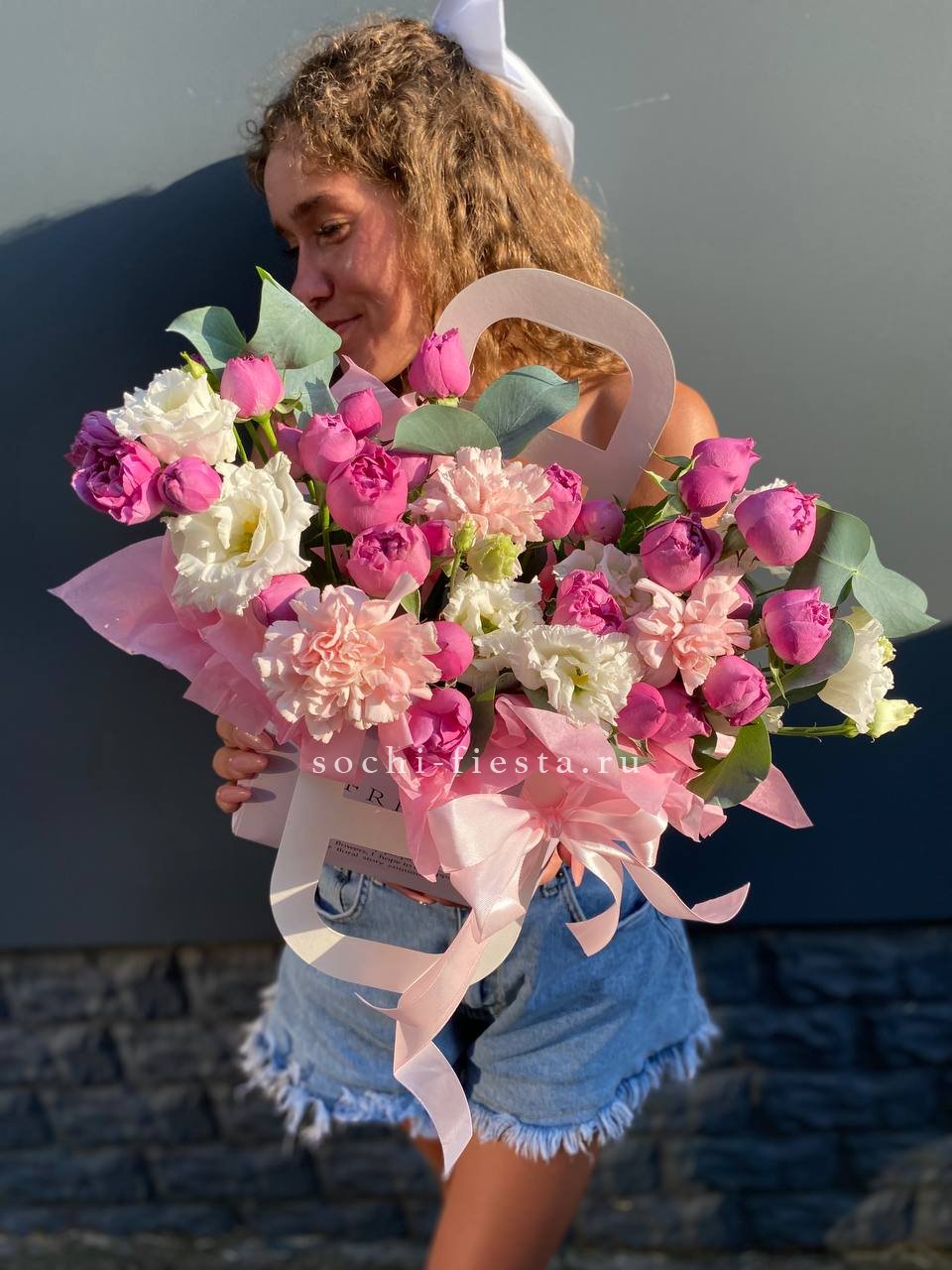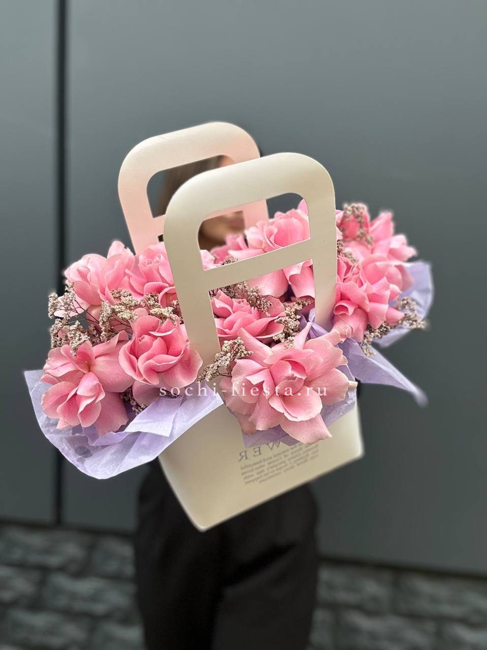 гортензия, розовые розы, эустома, диантусы,эвкалипт, лента, сумка-кашпо.