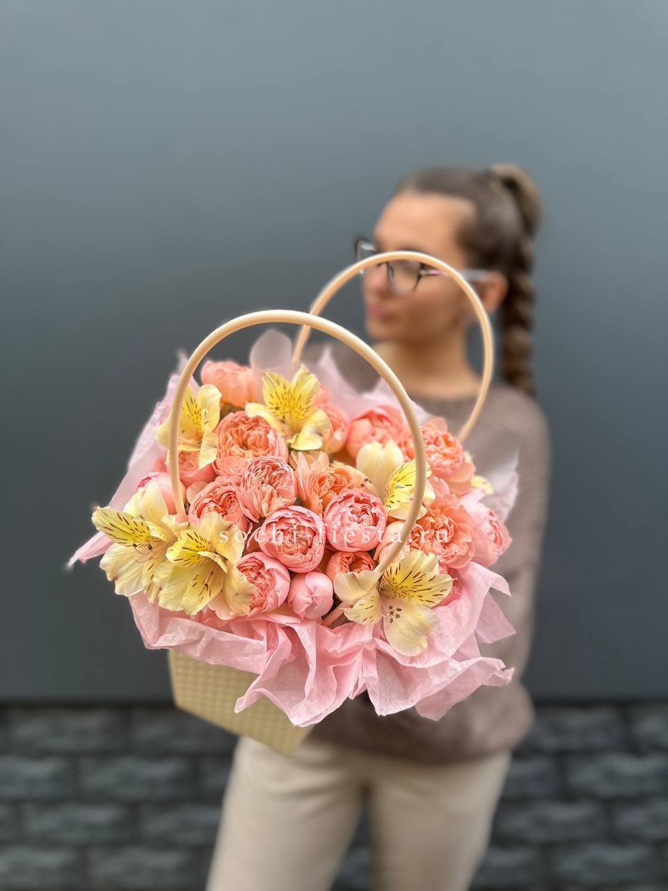Пионовидные розы Джульетта и яркие альстромерии собраны в компактную сумочку с лентой. Округлые бутоны создают мягкий объем, а формат позволяет разместить композицию на столе или полке.