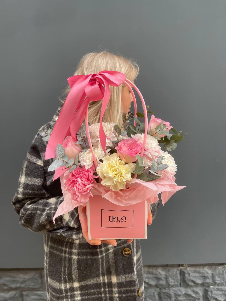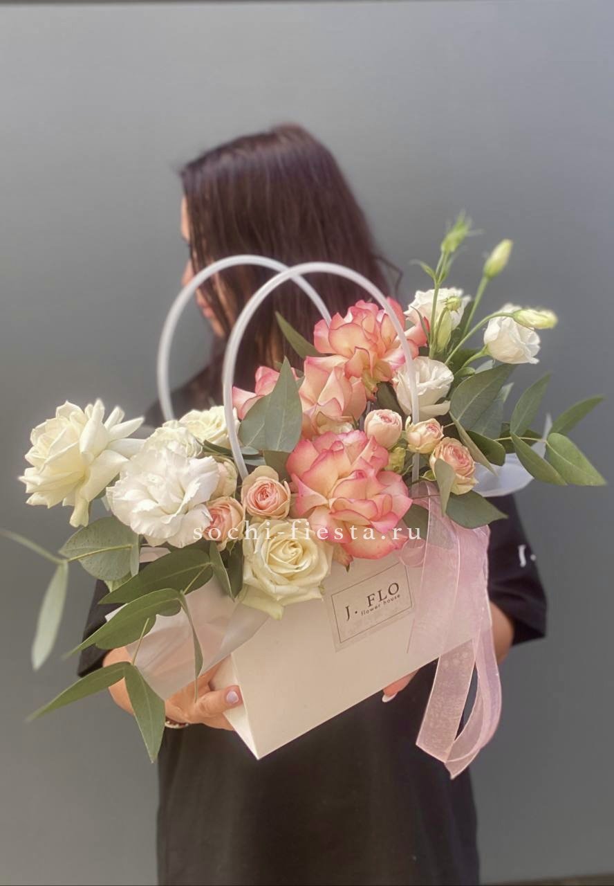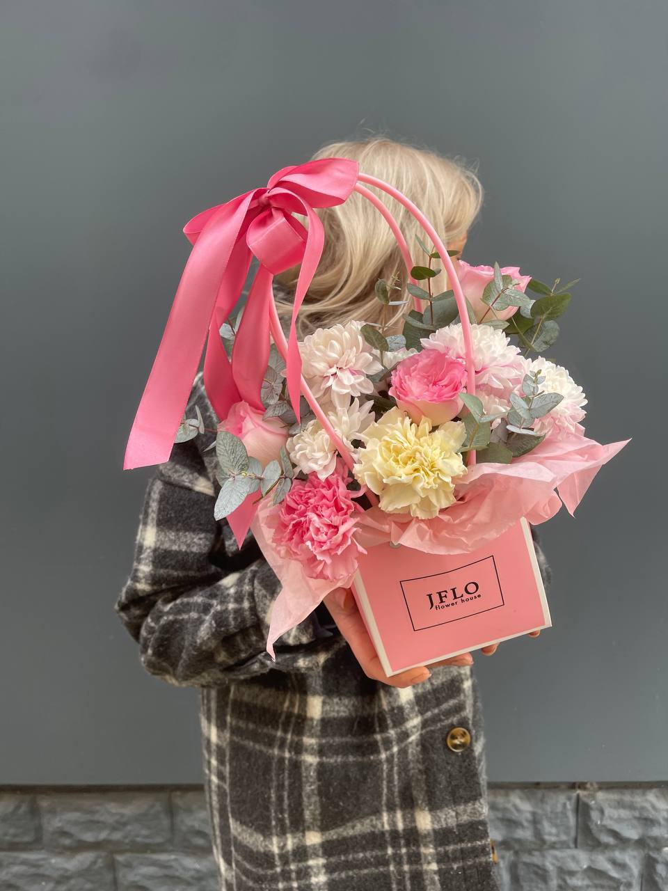 гербера, хризантема, диантус, статица, гортензия, сумочка.