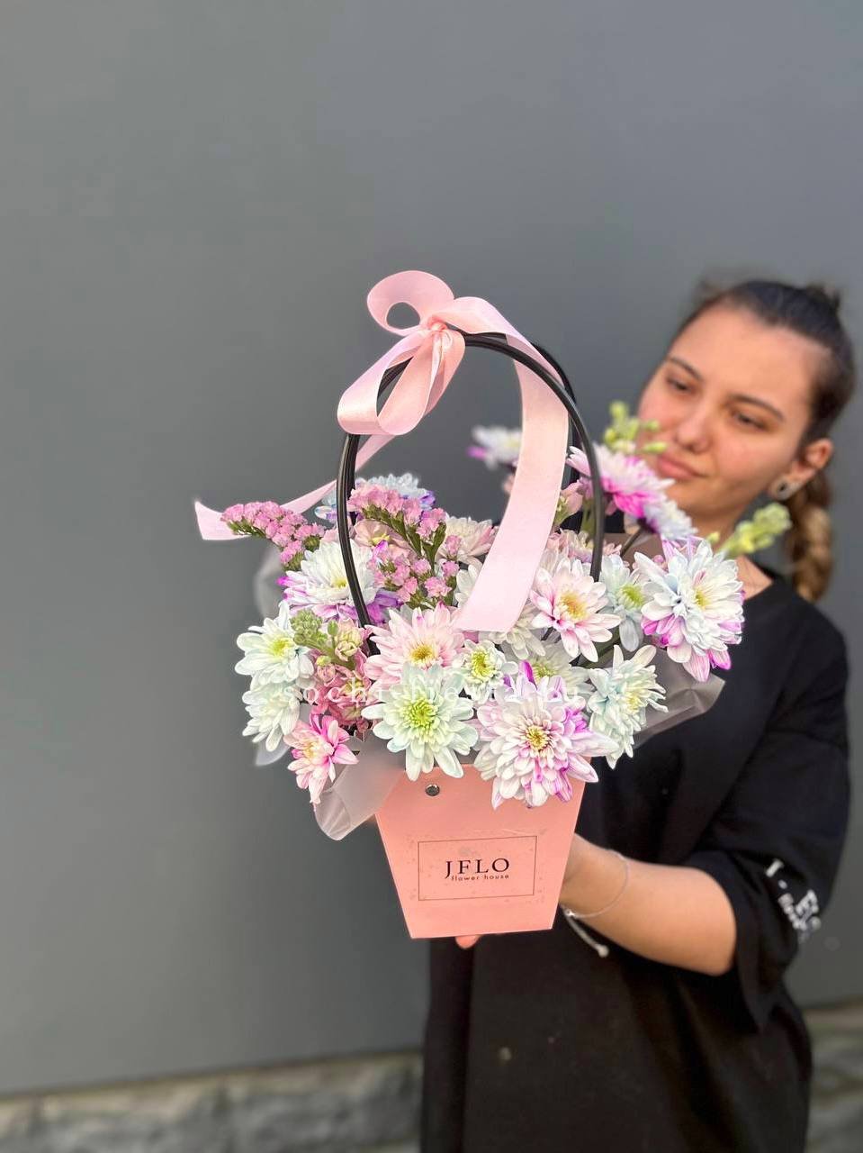 Хризантемы и маттиола собраны в компактную форму с лиловыми переливами. Статица добавляет воздушности, а сумочка делает композицию мобильной и готовой к вручению. Цветы закреплены в оазисе для длительной свежести.