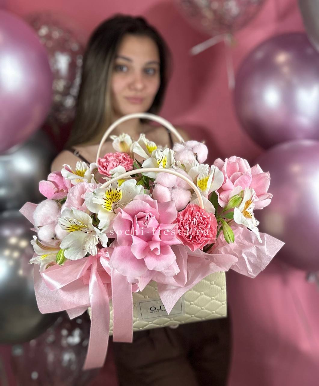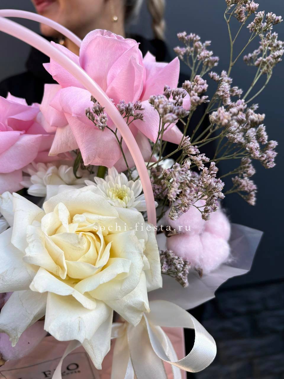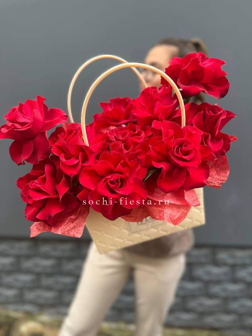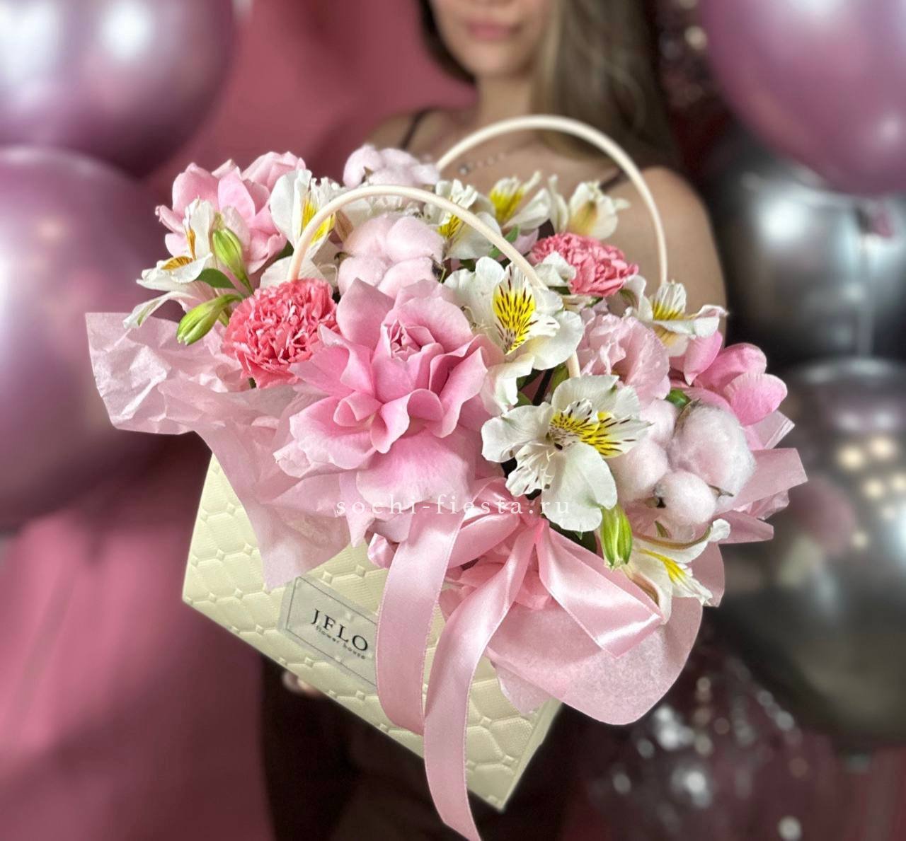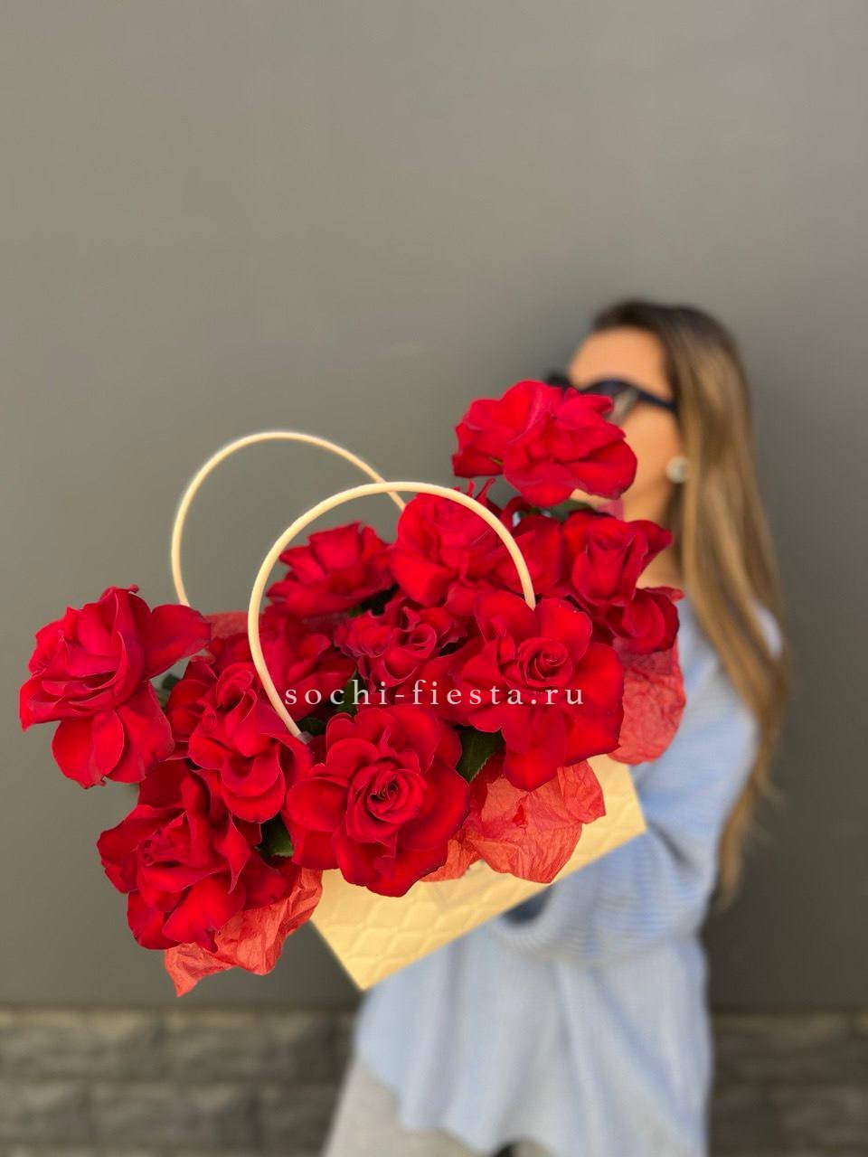 французские розы, лента, сумочка.