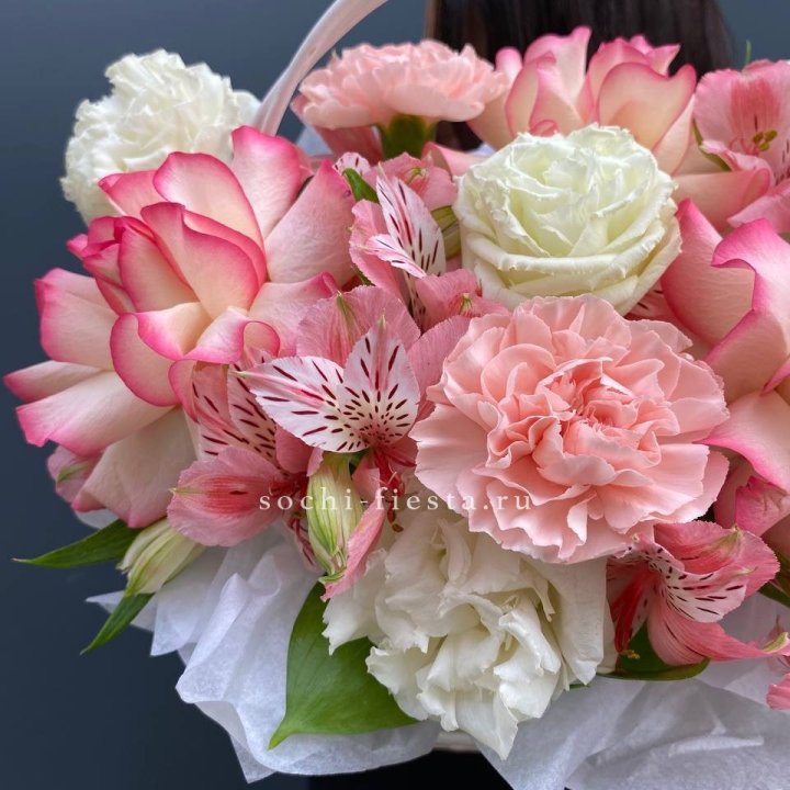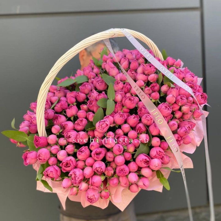 Состав корзин в Чебоксарах определяется текущими поставками и сезоном. Розы Freedom, Mondial, Cappuccino — для классических куполообразных аранжировок. Пионы в мае-июне из свежих поставок: Sarah Bernhardt, Red Charm, Bowl of Cream — главный сезонный продукт. Хризантема, альстромерия, гербера — для объёмных торжественных наполнений. Эустома, ранункули — для садовых корзин. Флорист строит состав под конкретный запрос.
